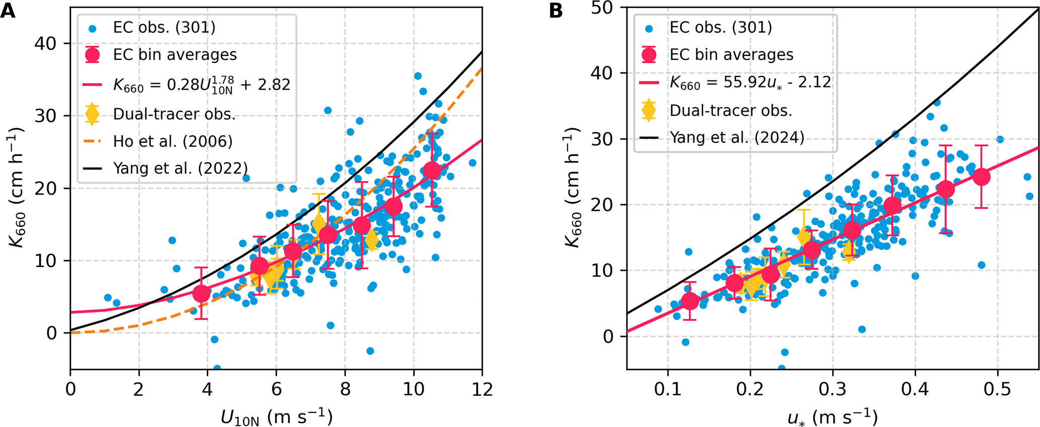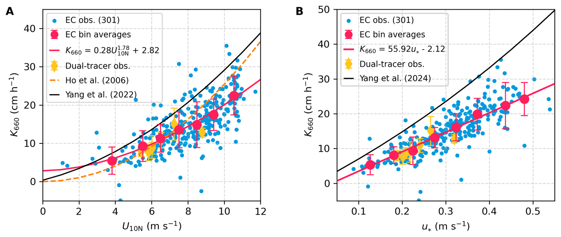 Figure 4Gas transfer velocity (K660_CO2) in the central Baltic Sea during the CenBASE cruise. (A) Relationships between K660 and U10N. (B) Relationships between K660 and observed u. Blue dots in both panels represent 10 min K660_CO2 (N=301), with red dots denoting bin averages (1 m s−1 U10N bins or 0.05 m s−1u bins) ± 1 SD. Red lines indicate the fit to the bins, with R2 of 0.48 for the fit with U10N and 0.59 for the fit with u. Yellow diamonds show dual-tracer (DT) transfer velocities (K660_3He/SF6) measured concurrently with EC. The orange line in panel (A) denotes the open ocean DT-based parameterisation from Ho et al. (2006). The black lines in panels (A) and (B) correspond to the open-ocean EC-based parameterisations of Yang et al. (2022; U10N-dependent) and Yang et al. (2024; u and sea-state dependent), respectively.