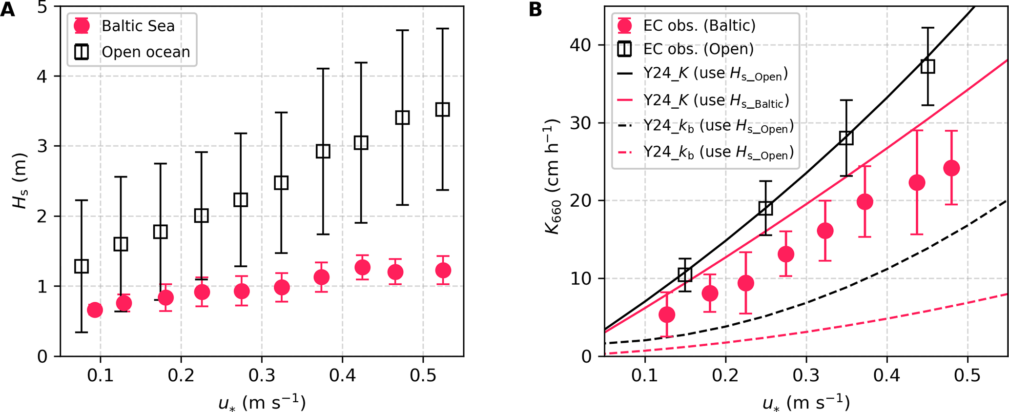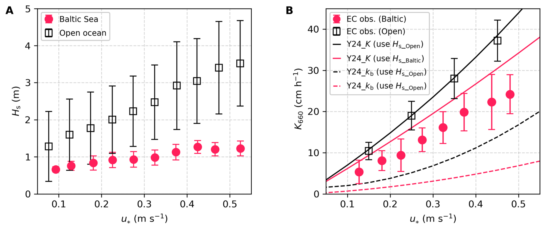 Figure 5Comparison of significant wave height (Hs) and K660_CO2 between the Baltic Sea and the open ocean. (A) Hs in the Baltic Sea during CenBASE (red dots) and in the open ocean (black squares), with error bars representing ± 1 SD. The data are extracted from ERA5 according to the EC cruise tracks (Yang et al., 2022) and the CenBASE cruise track. (B) K660_CO2 observations in the Baltic Sea during CenBASE (red dots, the same as the red dots in Fig. 4B) and in the open ocean (black squares, Yang et al., 2022). The black and red solid lines correspond to the parameterised total CO2 transfer velocity (i.e., K660_CO2 from Eq. 3; Yang et al., 2024) using the open ocean and the Baltic Sea Hs, respectively. The black and red dashed lines denote the parameterised bubble-mediated transfer component (Kb660; Eq. 3) using the open ocean and the Baltic Sea Hs, respectively.
