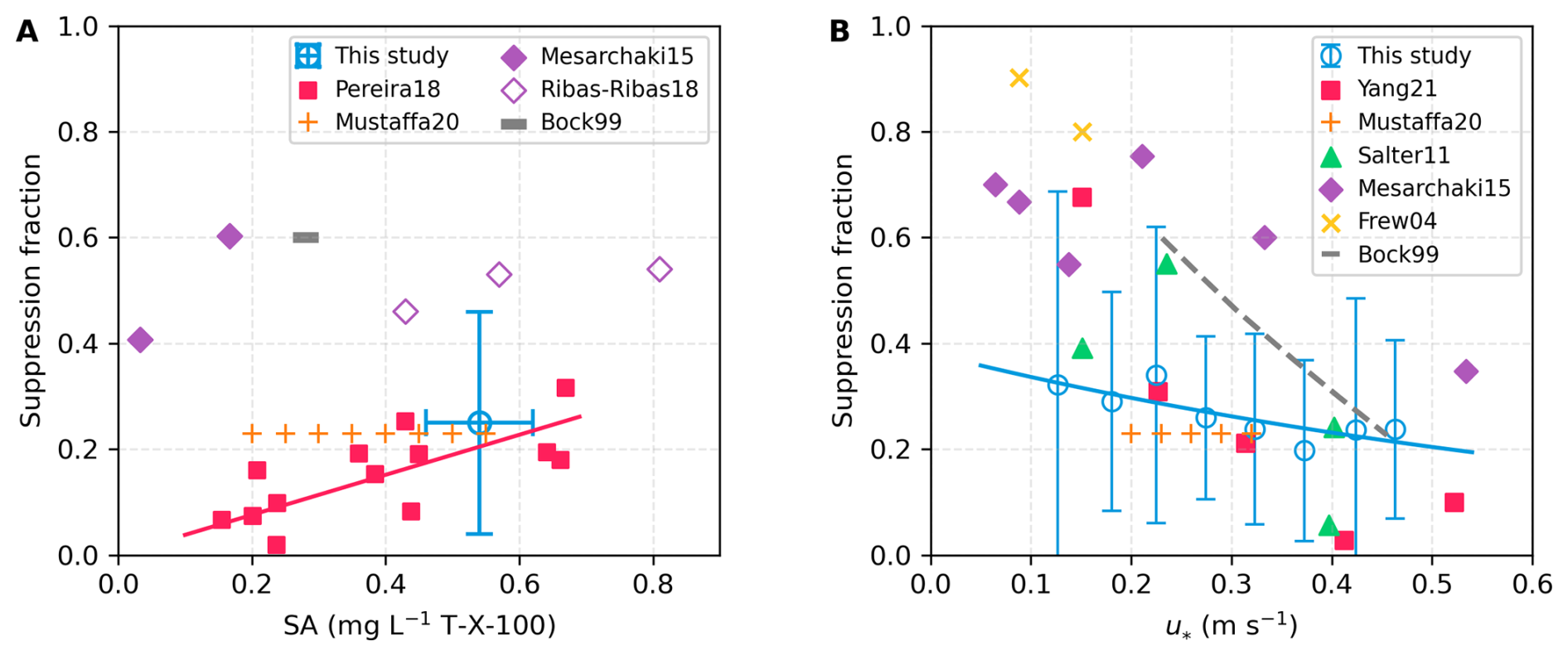 Figure 6Surfactant-induced suppression fraction on K660 (sf) from this study and previous work. (A) sf as a function of surfactant concentration under low-moderate wind speeds. The blue circle shows the mean constrained sf from this study; horizontal and vertical error bars denote the standard deviation of observed SA and the associated uncertainty of the constrained sf. Red squares indicate sf from wave-tank experiments with natural Atlantic seawater at wind speeds < 13 m s−1 (Pereira et al., 2018), with the red line showing the linear fit (sf= 38 ×SA). Orange pluses show sf constrained from field K660 observations using the chamber technique with natural surfactant (Mustaffa et al., 2020). Diamonds (filled/unfilled) and the grey dash represent wave-tank studies using artificial soluble surfactants (Mesarchaki et al., 2015; Ribas-Ribas et al., 2018; Bock et al., 1999). (B) sf as a function of u. Blue circles show sf constrained from the residual suppression of observed K660_CO2 from this study, with error bars indicating uncertainties. The blue line corresponds to the fit based on the blue circles (0.38 ×e1.25u, R2= 0.65). Red squares represent values derived from an EC-based CO2 transfer velocity study (Yang et al., 2021). Orange pluses denote the Mustaffa et al. (2020) dataset with surfactant concentrations of 0.2–0.6 mg L−1. Green triangles show sf inferred from EC-based DMS and DT exchange experiments in artificial insoluble surfactant patches (Salter et al., 2011). Purple diamonds represent Mesarchaki et al. (2015), who used  0.2 mg L−1 of artificial soluble surfactant. Yellow crosses indicate sf derived from coastal heat transfer measurements (Frew et al., 2004). The grey dashed line shows laboratory experiments with artificial soluble surfactants at  0.3 mg L−1 (Bock et al., 1999).