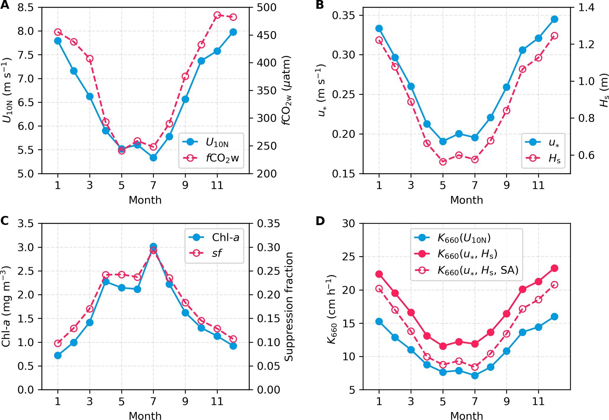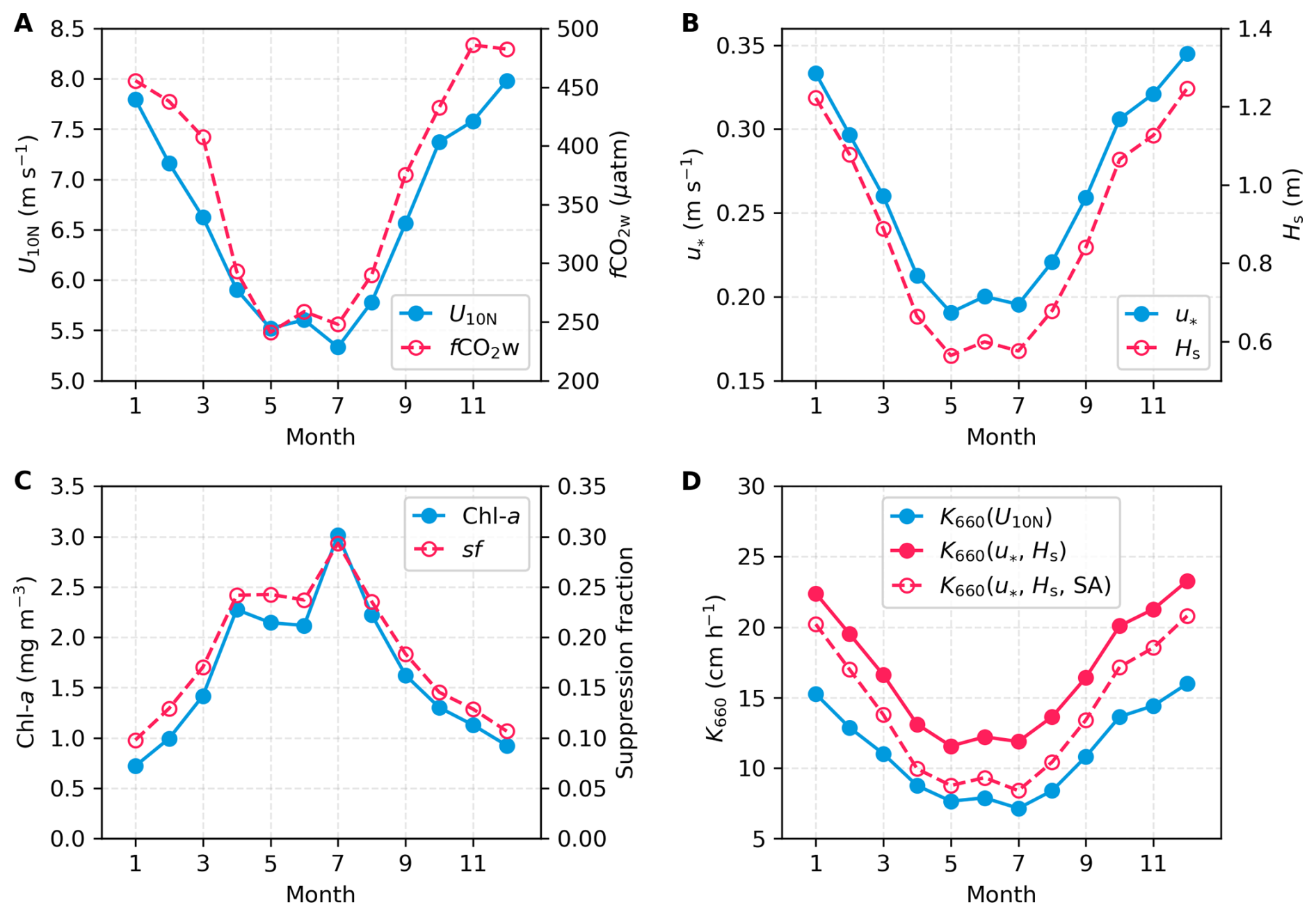 Figure 7Climatological seasonal variations of environmental variables and gas transfer velocities in the Baltic Sea. (A) U10N (blue) and fCO2w (red; Bittig et al., 2024). (B) u (blue) and Hs (red). U10N, u, and Hs are averaged from the ERA5 monthly reanalysis data product (Hersbach et al., 2020) for 1998–2018. (C) Surfactant concentrations scaled from monthly chlorophyll a (Chl a) (Pitarch et al., 2016) and surfactant-induced suppression fraction of K660 based on the SA- and U10-dependent parameterisation (Eq. 5). (D) K660 estimated from different parameterisations: U10N-based (blue; Ho et al., 2006), u-Hs-based (red solid; Eq. 3, Yang et al., 2024); u-Hs-SA-based (red dashed; Eq. 5).