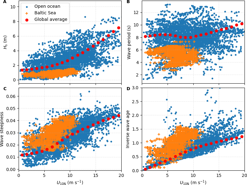 The friction velocity is a key parameter characterizing near-surface turbulence. Observed values of u from EC momentum fluxes during CenBASE were 10 % higher than modelled open ocean u at the same wind speeds (Fig. 3A), likely reflecting fetch-related differences. The wave field in the central Baltic Sea is much younger than in the open ocean, with wave age  60 % lower at the same wind speed (Fig. 3B). The waves are shorter and steeper than in the open ocean (Fig. A2). This wave field enhances sea surface roughness and elevates u relative to the open sea. u predicted by the COARE3.6 model, when forced with observed environmental and extracted wave parameters during CenBASE, broadly agrees with measurements (Fig. 3A). This suggests that the COARE model remains applicable in fetch-limited marine environments when wave information is included, despite being developed primarily from open-ocean observations (Edson et al., 2013). Given that u is an indicator of surface wind-induced turbulence, this elevated u is expected to enhance CO2 transfer velocity (see Sect. 3.4).