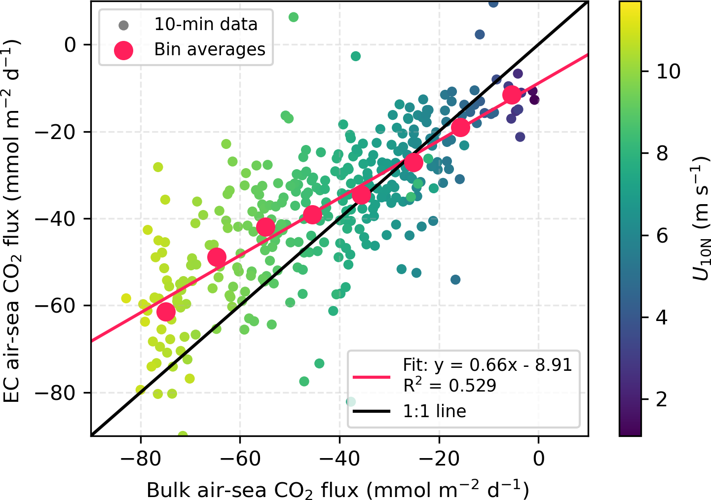 The EC dataset offers high temporal resolution ( 10 min), enabling investigation of small-scale processes influencing gas exchange. The EC observations span a broad range of wind speeds (1 to 12 m s−1, Fig. 4A), providing a robust constraint of K660_CO2 under low-to-moderate wind conditions. In contrast, DT-derived K660 represents daily averages, in which short-term extremes (i.e., low and high wind conditions) are smoothed, resulting in seven observations concentrated at U10N of 5–9 m s−1 (Fig. 4A). Within this wind range, DT-and EC-derived K660 values are in good agreement, with the former on average being only slightly ( 8 %) lower than the latter (Fig. 4).
