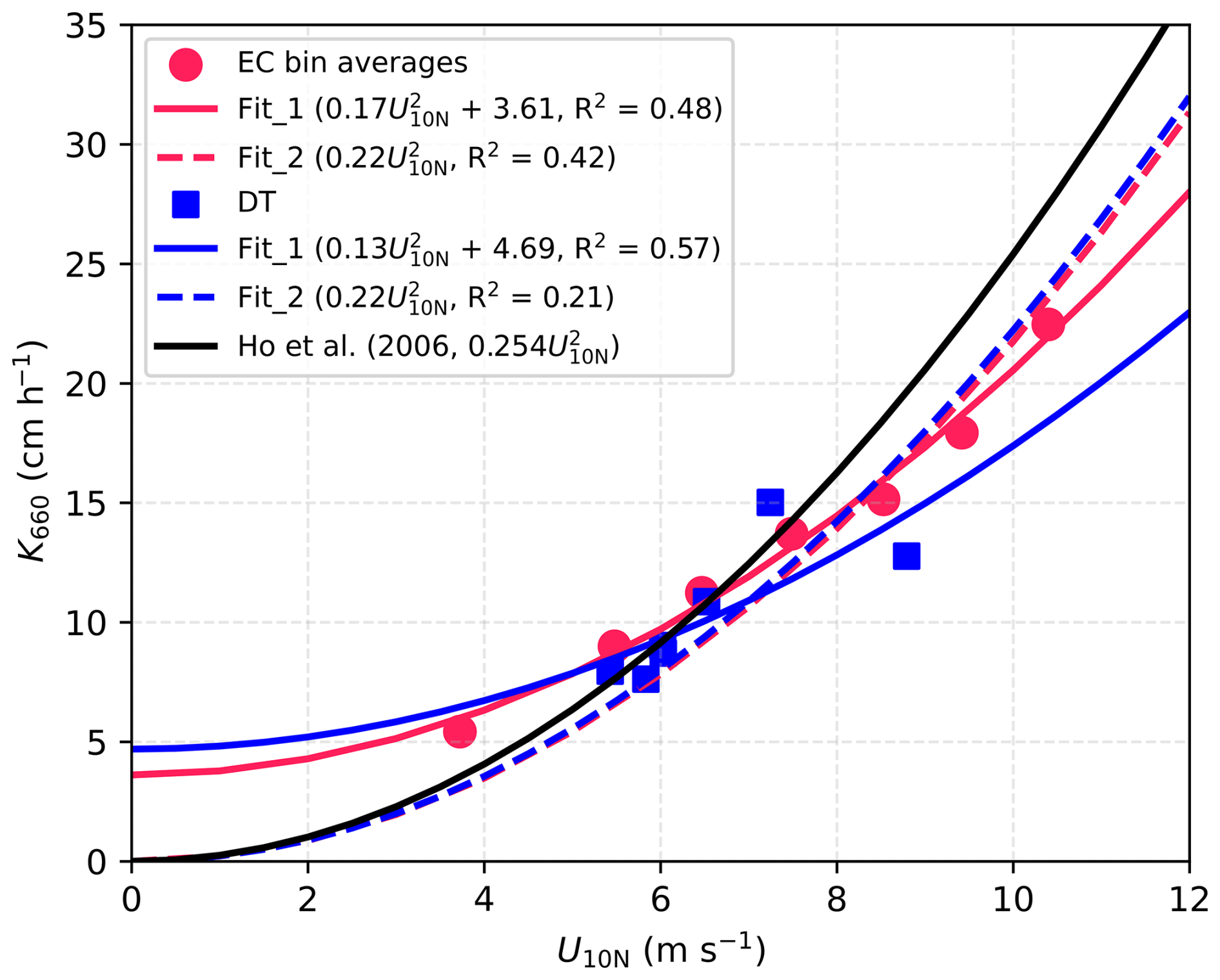 DT-derived K660 values during CenBASE also generally agree with the open-ocean DT-based parameterisation of Ho et al. (2006) under equivalent wind speeds (orange dashed line in Fig. 4A), with the former on average being only  7 % lower than the latter. However, EC-derived K660_CO2 values deviate systematically from this open-ocean relationship (Ho et al., 2006), being higher at low wind speeds (1–7 m s−1, +12 %) and lower at high wind speeds (7–12 m s−1, 18 %) (Fig. 4A). This divergence does not contradict the agreement between the DT-and EC-based K660 observations, as this agreement falls within the 5–9 m s−1 range (where the DT data concentrate). Fitting K660_CO2 with U10N reveals a weaker wind speed dependence than the open ocean DT-based parameterisation (Fig. 4A). It is worth noting that including a constant term in the K660_CO2-U10N fitting function (i.e., K660_CO2=aU10Nb+c, R2= 0.48) improves the fit compared to a purely power-law form (i.e., K660_CO2=aU10Nb, R2= 0.42) (Fig. A5), suggesting a non-zero CO2 exchange ( 3 cm h−1) under calm conditions. This is unsurprising, since the chemical enhancement (Cole and Caraco, 1998; Fairall et al., 2022; Yang et al., 2022) and likely buoyancy flux sustain CO2 transfer at low wind speeds (McGillis et al., 2004; Wanninkhof et al., 2009).
