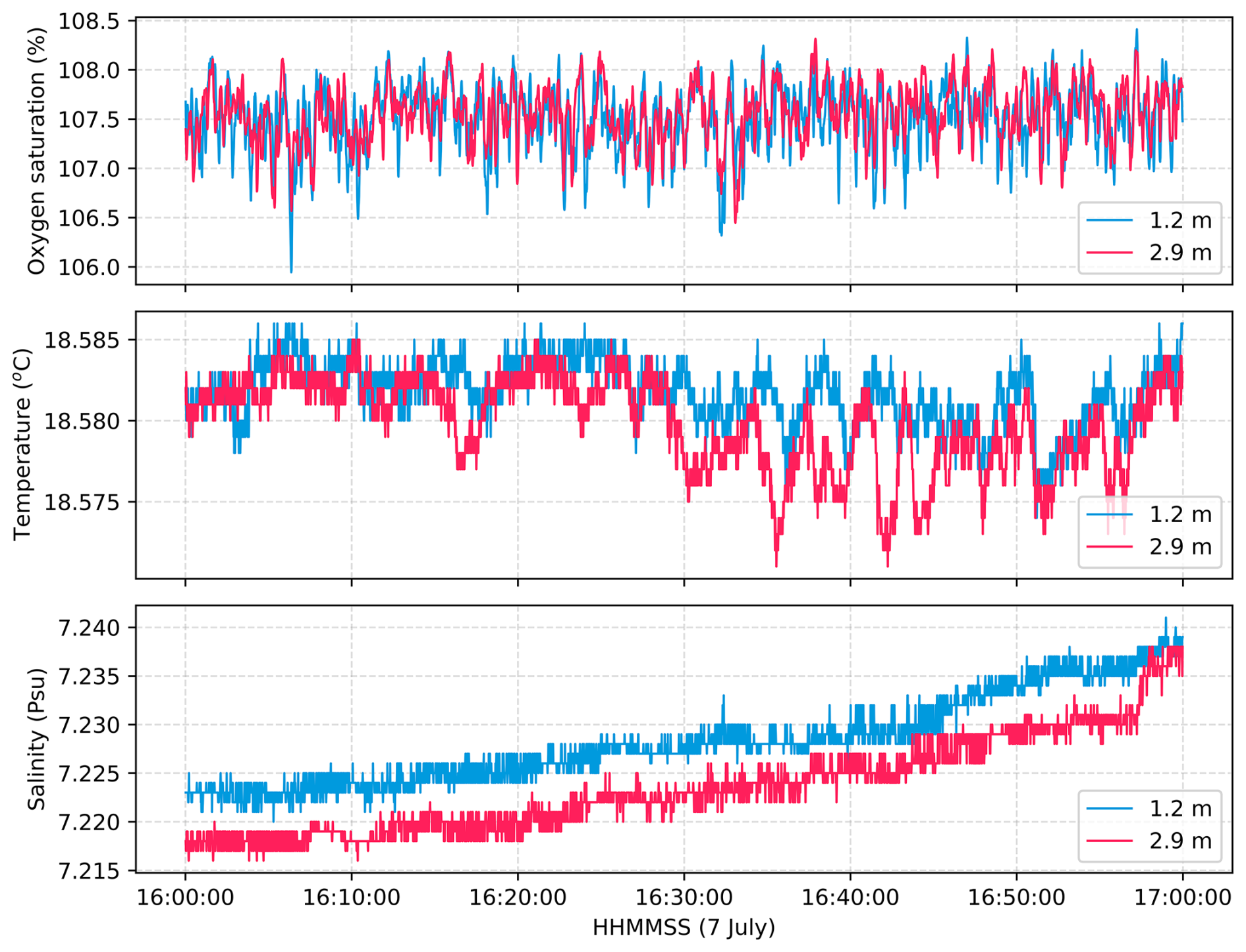 Previous studies have suggested that water-side convection may influence gas exchange in both open-ocean (McGillis et al., 2004) and Baltic conditions (Rutgersson and Smedman, 2010). During CenBASE, a small spar buoy recorded oxygen, temperature, and salinity at depths of 1.2 and 2.9 m. Dissolved oxygen exhibited small-scale variability with similar patterns at both depths (Fig. A7), indicating coherent near-surface structure over 5–20 m scales, likely driven by wind-induced turbulence intermittently exposing surface patches to the atmosphere. In contrast, no corresponding variability was observed in temperature or salinity (Fig. A7), suggesting that convection played a negligible role in gas exchange under the observed conditions. This supports our assumption that the deviation in K660_CO2 between the Baltic Sea and the open ocean can be fully attributed to the combined effects of limited fetch and elevated surfactant levels.