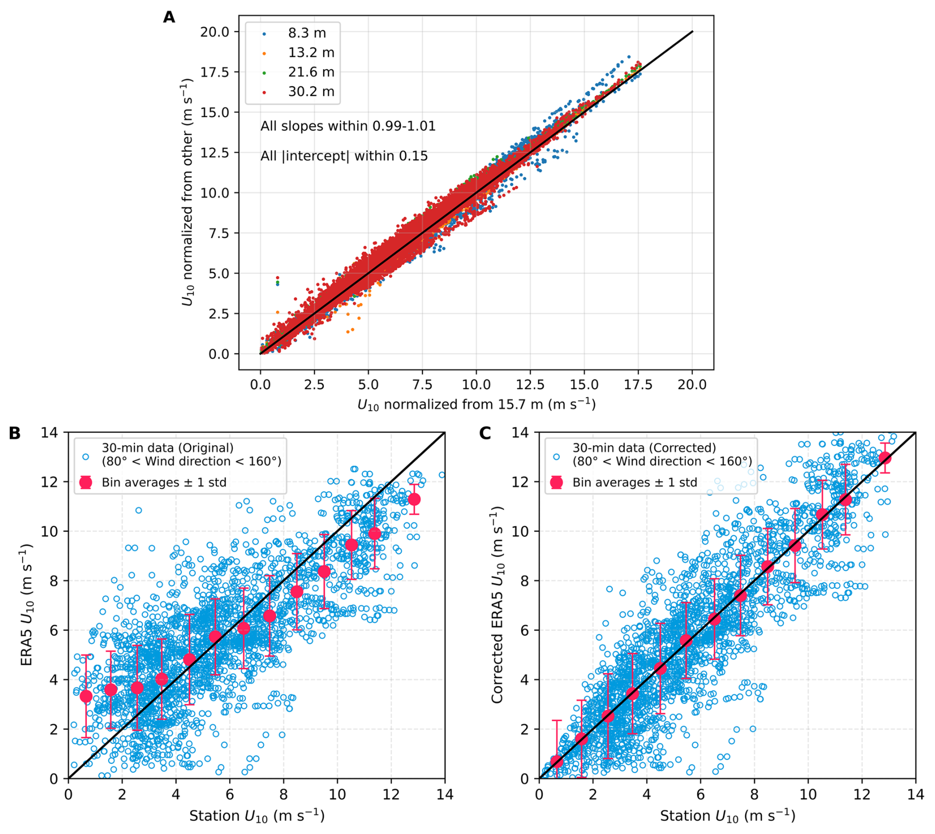 Because ERA5 winds may contain regional biases, we first calibrate ERA5 using in situ measurements from the Östergarnsholm station (Rutgersson et al., 2020). Winds from five measurement heights (normalized to U10) are highly consistent, supporting the robustness of the station record (Fig. A8). We then compare station winds with ERA5 winds extracted at the station location for the period March–December 2024. To avoid land contamination, only winds from the open sector (80–160°; Rutgersson et al., 2020) are used. ERA5 is slightly lower than the station wind below 6 m s−1 but higher at stronger winds (Fig. A8). Two linear regressions are applied to ERA5 data, resulting in good agreement with the station winds (Fig. A8). Although the ERA5 wave data used in this study are simulated by a wave model forced with ERA5 winds, which may contain minor biases, these are not expected to substantially affect the simulated wave fields (Durrant et al., 2013).