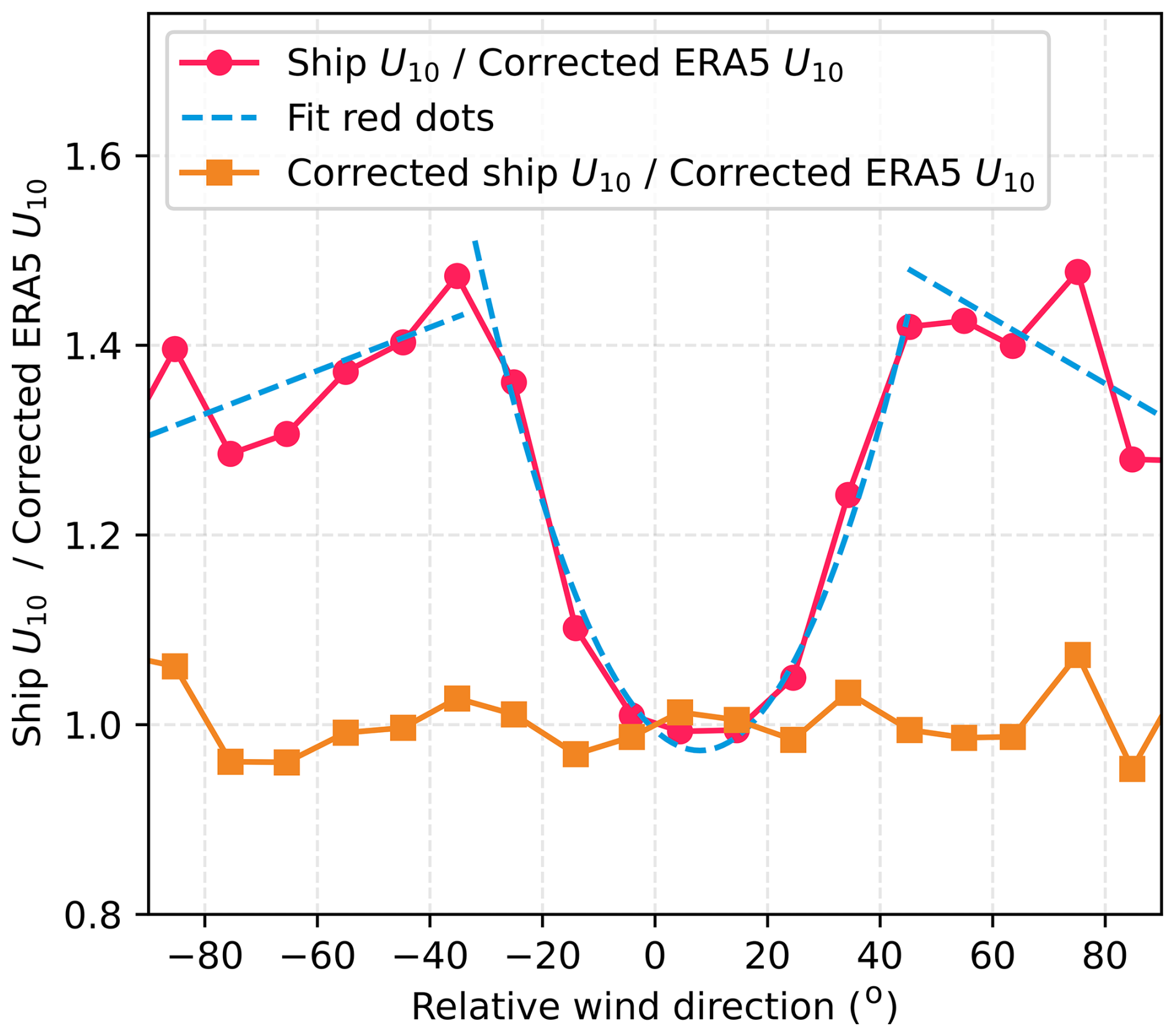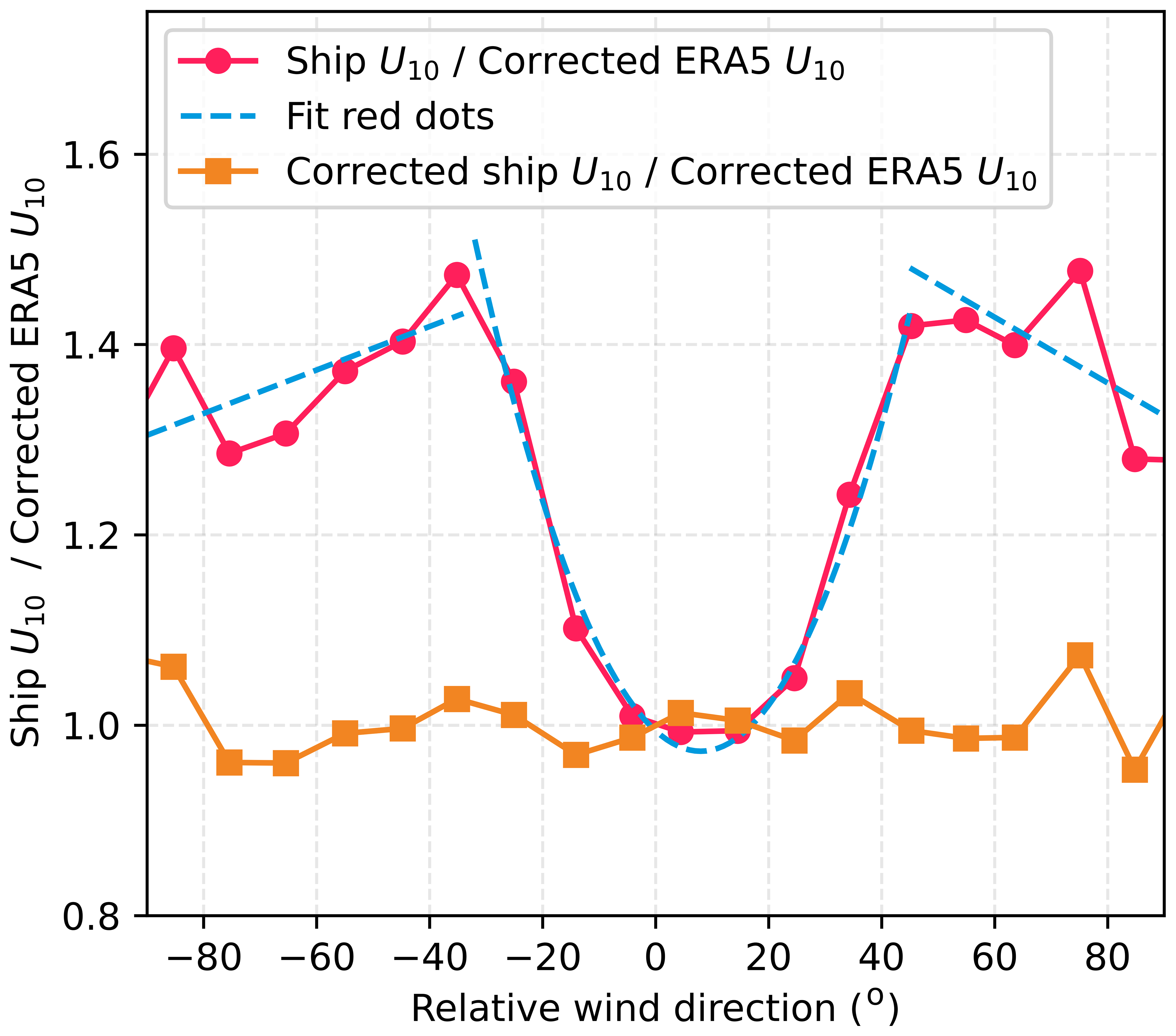 The corrected ERA5 winds are then extracted at the CenBASE cruise location and time to serve as a reference for correcting ship wind distortions. The ratio of ship to corrected ERA5 wind speed as a function of relative wind direction shows the expected distortion pattern (Fig. A9; Moat et al., 2006; Moat and Yelland, 2015). We fit this ratio using three functions according to the relative wind direction: (1) quadratic for 30 to 45°, (2) linear for 90 to 30°, and (3) linear for 45 to 90° (Fig. A9). This fitted relationship is used to correct the ship's wind speed. After correction, the ratio of ship to ERA5 wind speeds aligns closely with unity (Fig. A9).
