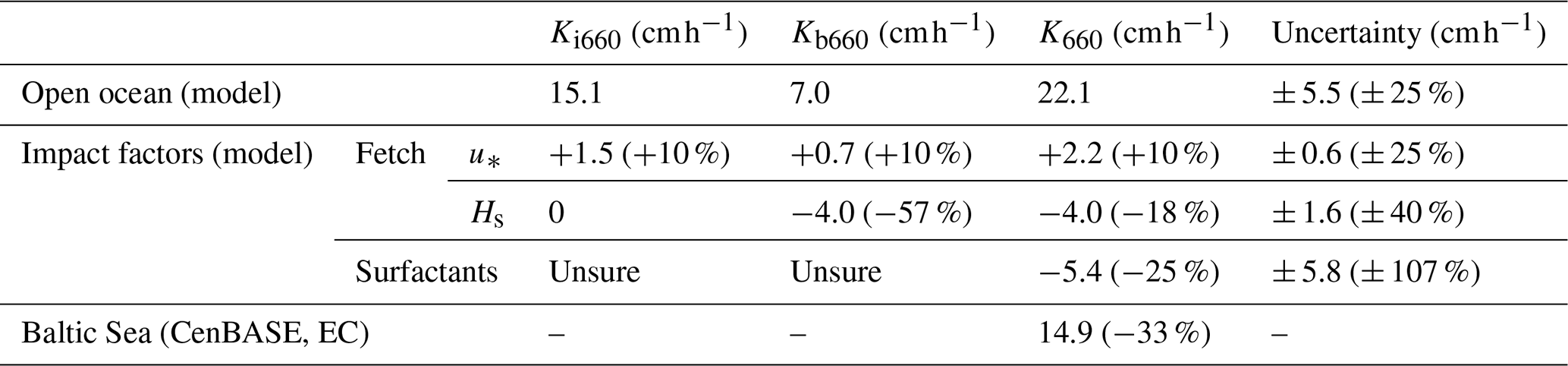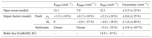Table 1Comparison of mean gas transfer velocities between measurements in the Baltic Sea and estimates using the open ocean parameterisation from Yang et al. (2024) under identical wind speed conditions (Eq. 3). The percentages in parentheses in the Ki, Kb, and K columns indicate the relative difference between the Baltic Sea and the open ocean. The last column is the uncertainty assessment of the values in the K column with the values in parentheses representing the relative uncertainties. The positive (negative) sign represents the enhancement (suppression).