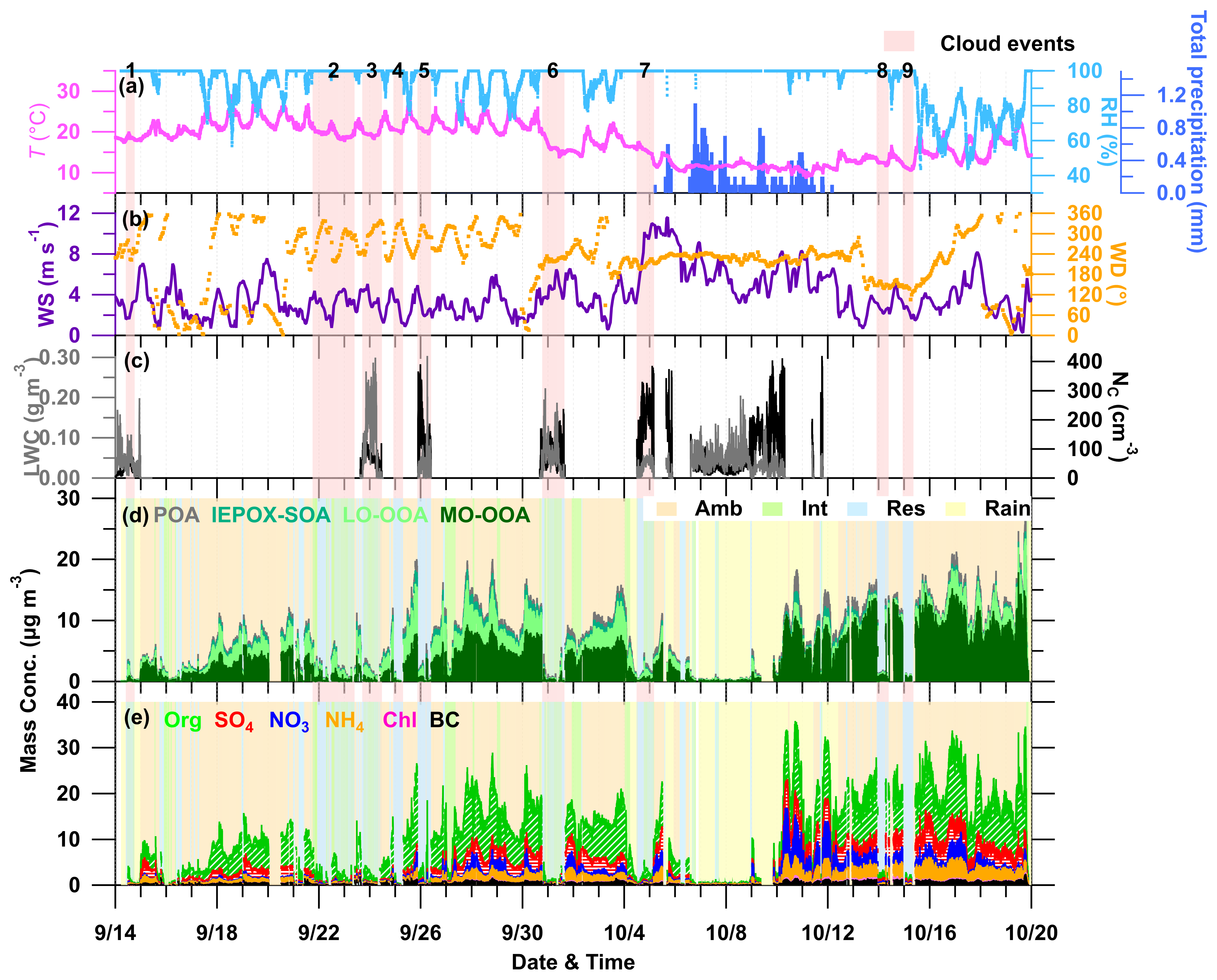 Figure 1Overview of the measurements during the field campaign in 2023. (a, b) Meteorological parameters, (c) LWC and Nc, (d) OA factors, (e) particles compositions. The red-shaded area represents the cloud events, while the background shading in panels (d) and (e) corresponds to ambient (AMB), interstitial (INT), residual (RES), and rain (RAIN) periods, shown in orange, green, blue, and yellow, respectively.