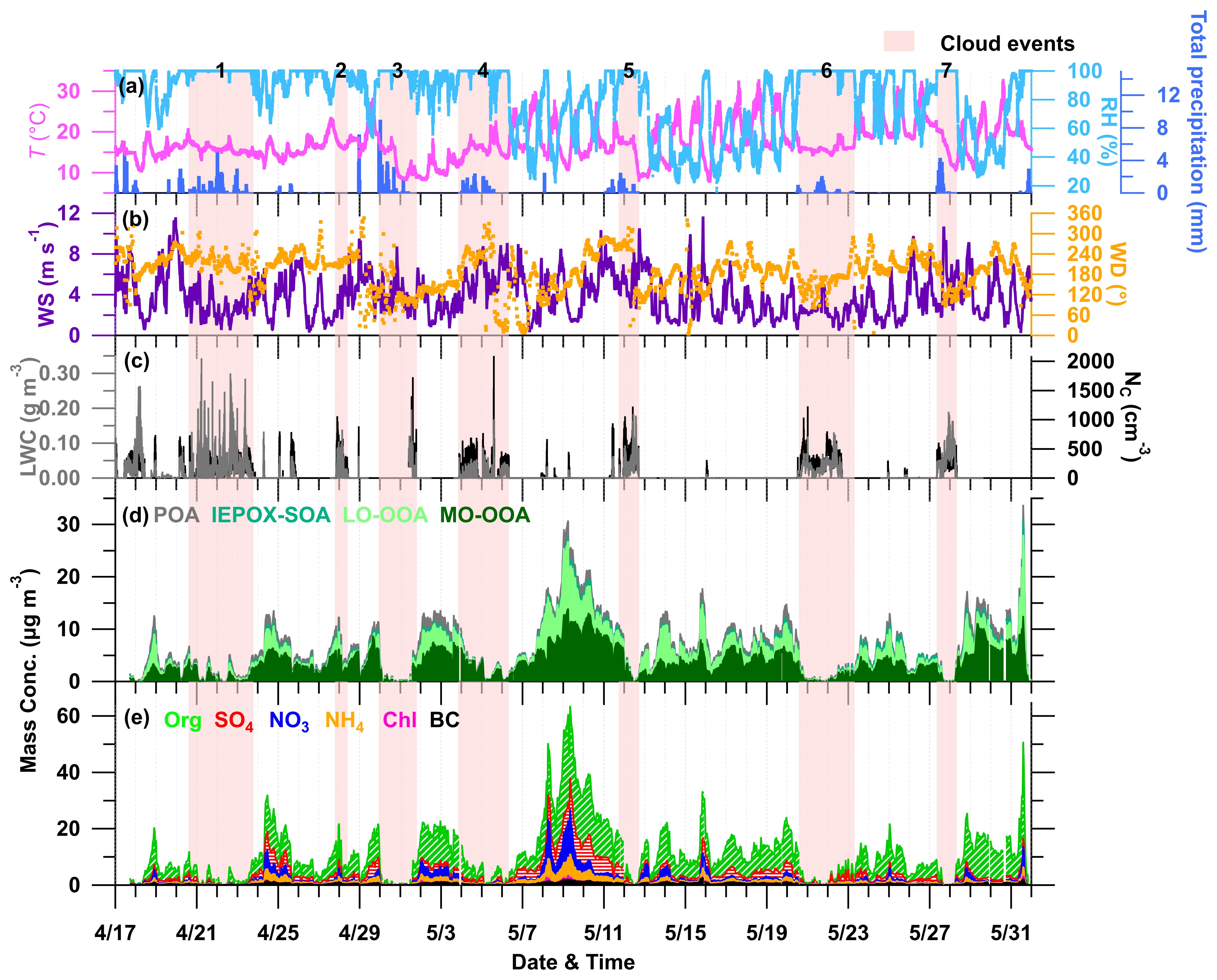 Figure 2Overview of the measurements during the field campaign in 2024. (a, b) Meteorological parameters, (c) LWC and Nc, (d) OA factors, (e) chemical compositions of PM2.5 particles during the entire campaign. The red-shaded area represents the cloud events.