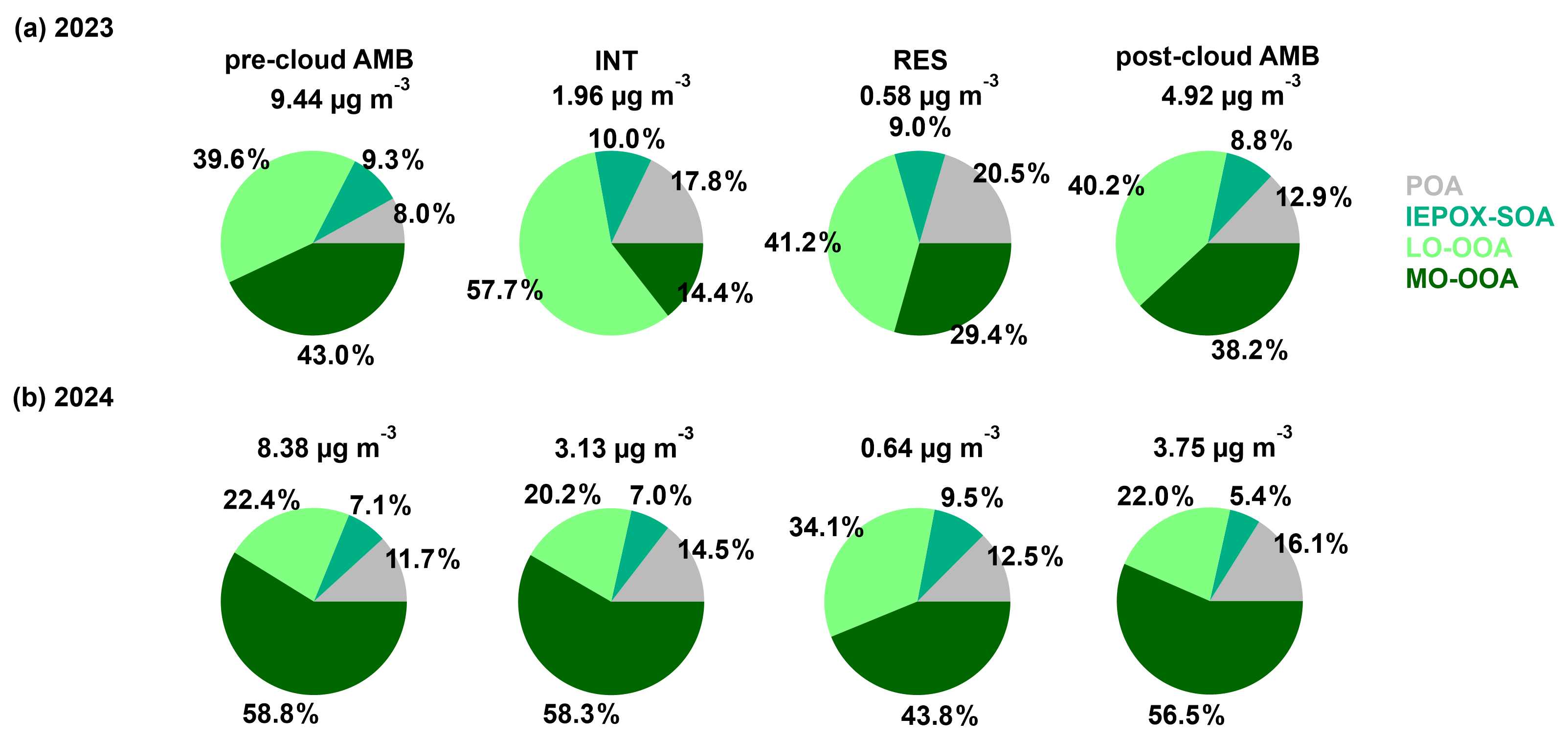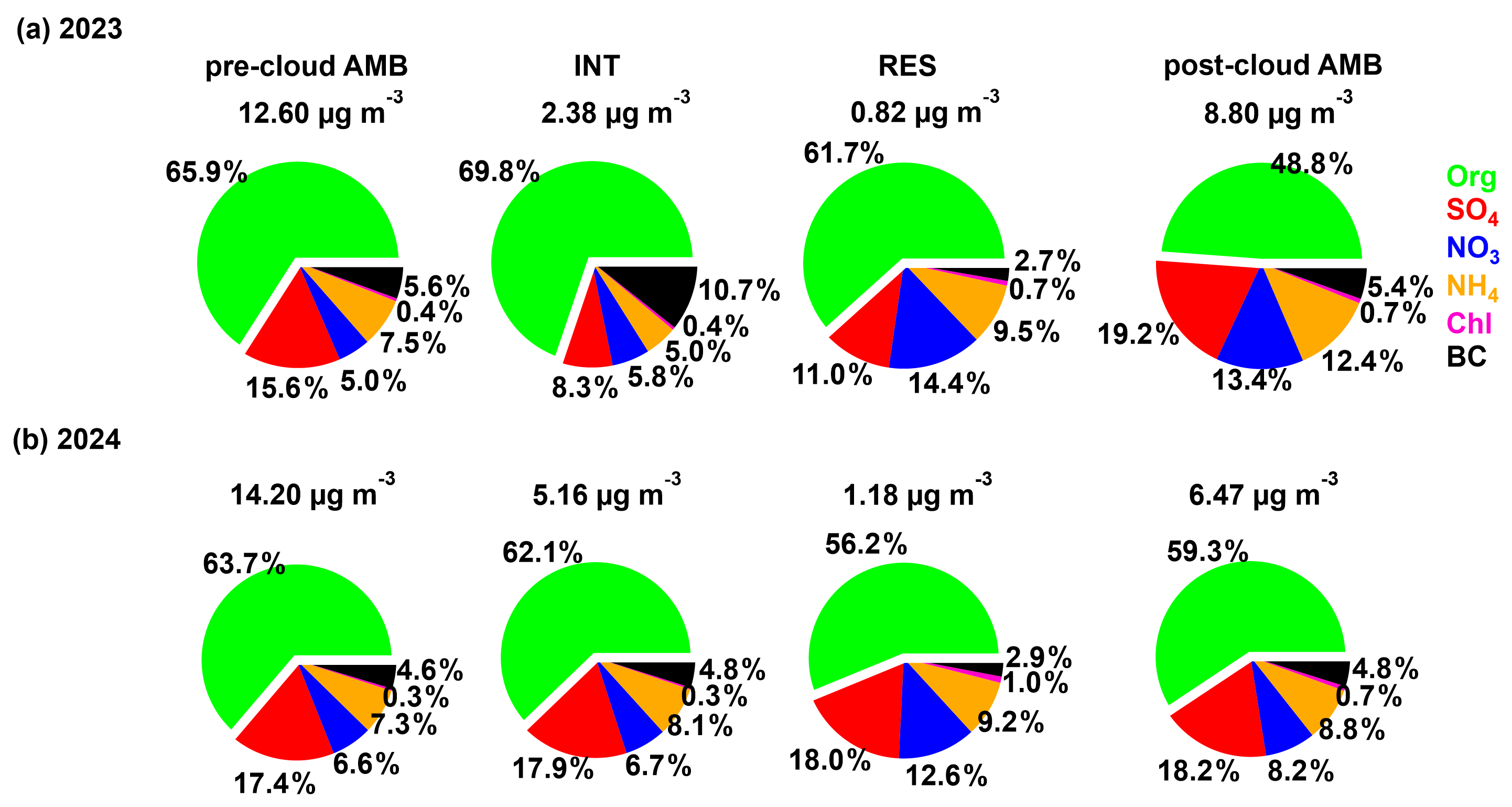 Figure 3Average chemical composition of different types of particles (pre-cloud AMB, INT, RES and post-cloud AMB) in (a) 2023 and (b) 2024.