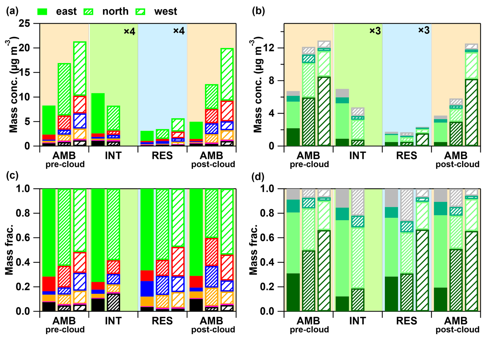 Figure 6(a, b) Mass concentrations and (c, d) mass fractions of four types of particles (pre-cloud AMB, INT, RES and post-cloud AMB) influenced by air masses from different sources (east, north, west) during the 2024 observation period.