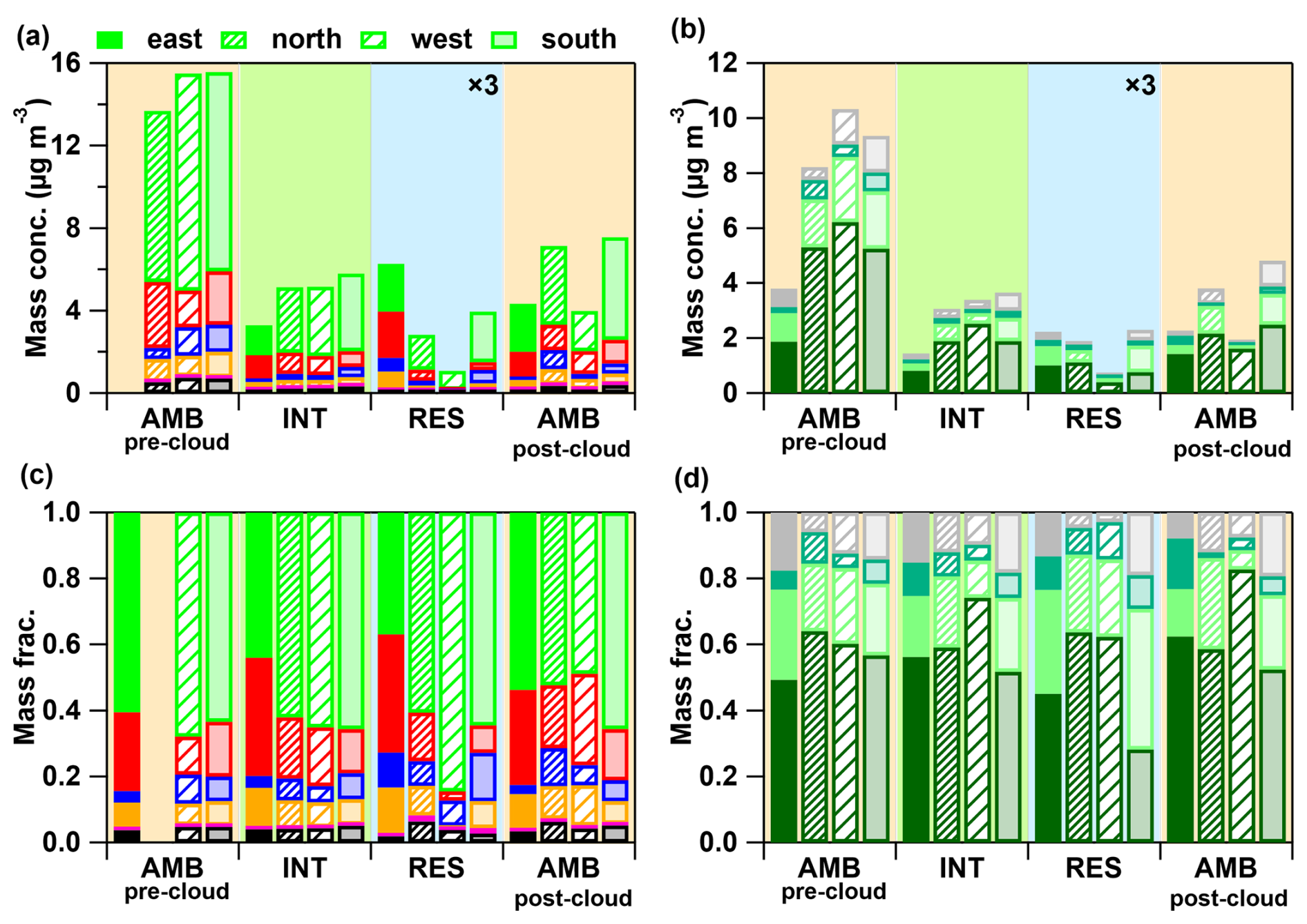 Figure 5(a, b) Mass concentrations and (c, d) mass fractions of four types of particles (pre-cloud AMB, INT, RES and post-cloud AMB) influenced by air masses from different sources (east, north, west) during the 2023 observation period.