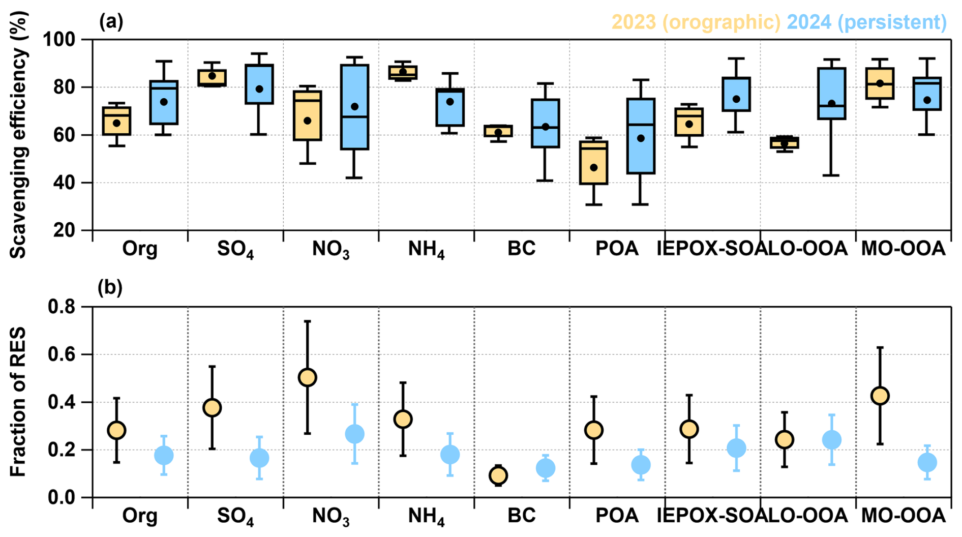 Figure 7(a) Scavenging efficiency of chemical components in 2023 and 2024. (b) Average fraction of chemical components in RES particles ()) during cloud events in 2023 and 2024.