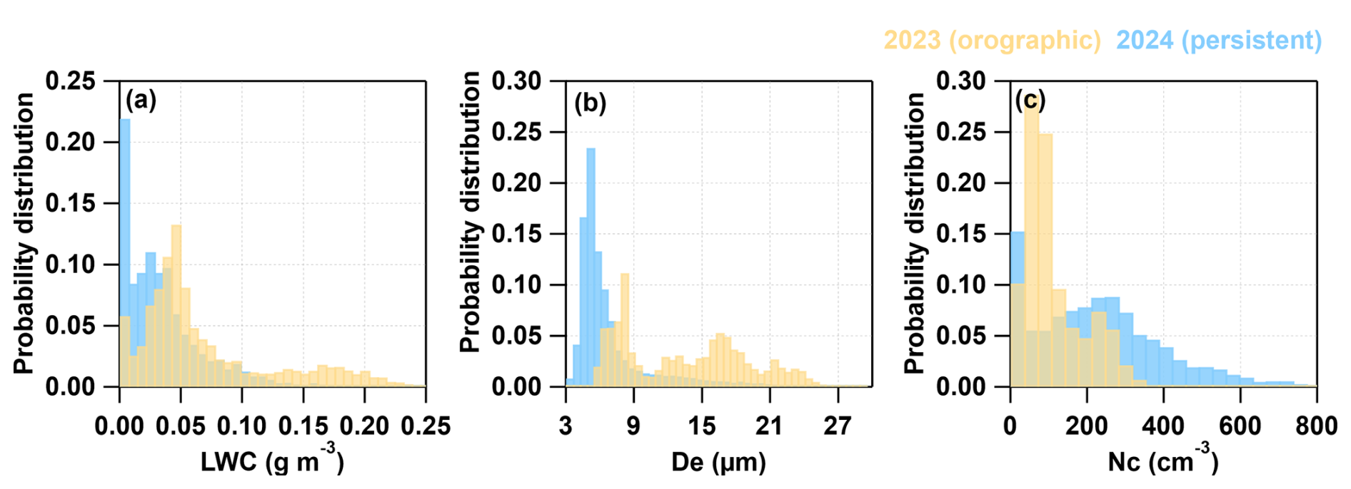 A Time-of-Flight Aerosol Chemical Speciation Monitor (ToF-ACSM; Aerodyne Research Inc., USA) equipped with a capture vaporizer and PM2.5 aerodynamic lens and a seven-wavelength Aethalometer (AE33; Magee Scientific Corp., USA) were connected with the end of GCVI or ACSIS to measure non-refractory aerosol species including organics (Org), sulfate (SO4), nitrate (NO3), ammonium (NH4), chloride (Chl), and equivalent black carbon (BC). The time resolution of the measurements is 2 and 1 min, respectively. For microphysical parameters of cloud droplets, a fog monitor (FM-100; Droplet Measurement Technologies LLC, USA) was used to optically measure size and number concentration of cloud droplets with size ranging from 2–50 µm. The instrument resolves particles into 30 size bins, with variable bin widths: 1 µm for droplets smaller than 14 µm and 2 µm for larger droplets. The time resolution of FM-100 is 1 s. Liquid water content (LWC), the total number concentration (Nc), effective diameter (De) and volume-mean diameter (Dv) of cloud droplets were determined as previous studies (Ding et al., 2025).