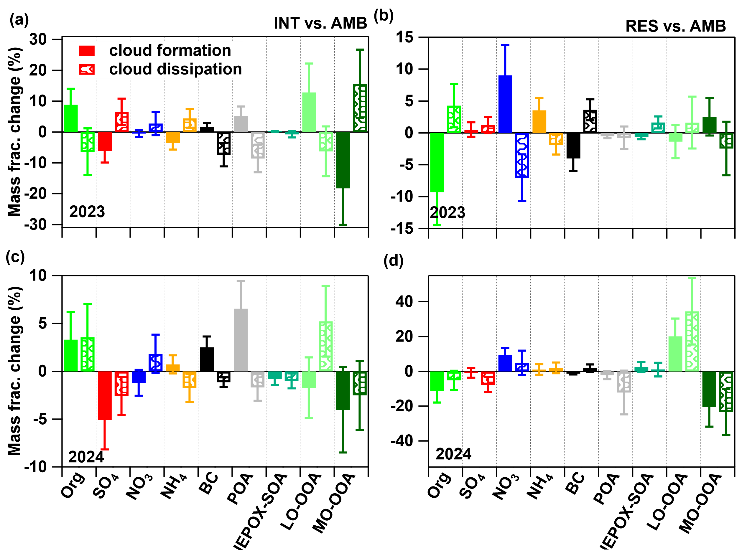 Figure 9Mass fraction changes of chemical species between INT and AMB particles during cloud formation and dissipation in (a) 2023 and (c) 2024, and changes between RES and AMB particles in (b) 2023 and (d) 2024.
