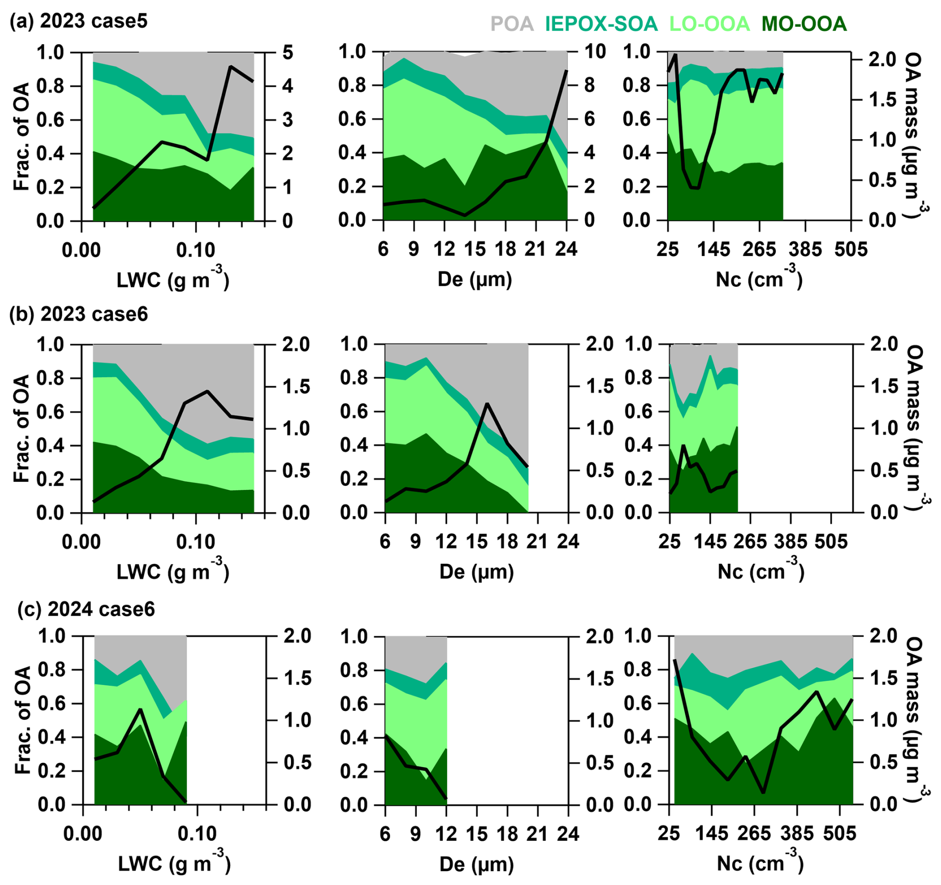 To further investigate the variation characteristics of organics within cloud droplets, two representative cloud events in 2023 and one in 2024 were selected. The variations in the fractional contributions of organic components and the total mass concentration of organics with respect to cloud microphysical parameters were analyzed (Fig. 10). During the selected events in 2023, the mass fraction of LO-OOA in RES particles increased as the LWC and De decreased, whereas the fraction of POA showed an opposite trend, increasing with higher LWC and De. In contrast, IEPOX-SOA exhibited little variation under different microphysical conditions. These results suggest that the formation of in-cloud SOA tends to occur preferentially in smaller droplets, consistent with the results in Sect. 3.3.1, where smaller droplets were found to promote the formation of LO-OOA. This could be attributed to the larger unit surface area of smaller droplets, which enhances the uptake coefficient of gaseous precursors (Guo et al., 2019; Ervens et al., 2011), or to their longer atmospheric residence time, allowing for more extensive aqueous-phase oxidation of organics (Chandrakar et al., 2016; Yeom et al., 2025). However, Sect. 3.4 does not provide clear evidence for suppressed MO-OOA formation in smaller droplets; in some cases (e.g., Case 6 in 2023), the MO-OOA fraction even increases with decreasing droplet size, indicating a more complex response of SOA composition. In contrast, POA appeared to be more efficiently incorporated into larger droplets through in-cloud scavenging. A similar perspective was reported in studies on the in-cloud removal of BC, which suggested that 30 %–90 % of BC is incorporated into cloud droplets through collision-coalescence processes, particularly within larger droplets where such interactions are more pronounced (Ding et al., 2025). Based on this, it is reasonable to infer that POA, sharing similar emission sources and hygroscopic properties with BC, could also be incorporated into cloud droplets through comparable processes, making it more associated with larger droplets. In 2024, both the LWC and De were relatively smaller and exhibited more gradual variations. Nevertheless, a trend similar to that observed in the 2024 cloud event was still evident, indicating comparable compositional responses of organic components under differing microphysical conditions.