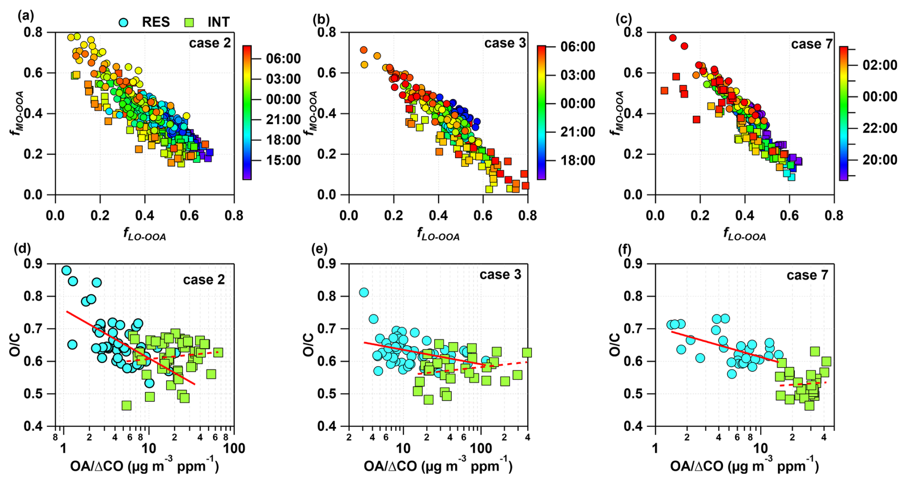 Figure 11(a–c) Time variations of the fraction of SOA (LO-OOA and MO-OOA) in RES and INT particles during case 2, 3 and 7, respectively in 2023. The green square and blue circles represent Int and Res particles respectively. (d–e) ratio as a function of ratio in RES and INT particles during case 2, 3 and 7, respectively in 2023.