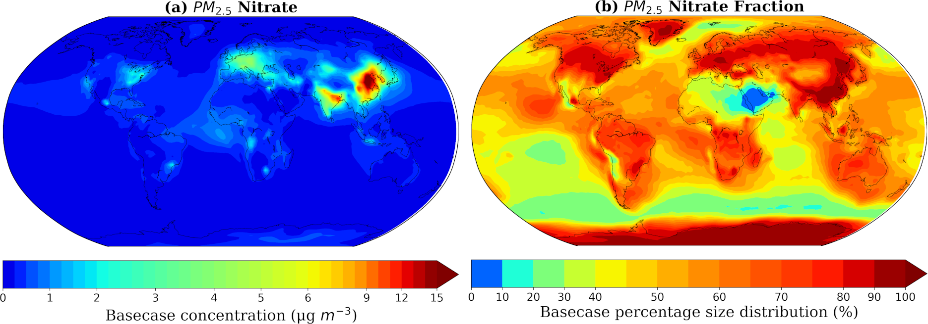 Aerosols are a critical and complex component of the Earth's climate system due to the complexity of their chemical composition and the many changes they undergo during their atmospheric lifetime. The composition of anthropogenic aerosols, influenced by the diverse precursor gases emitted by anthropogenic activities, plays a pivotal role in shaping climate and air quality. Of particular concern are aerosols with a diameter of less than 2.5 µm (PM2.5), which have been linked to a significant global mortality rate, estimated to exceed four million deaths per year (Chowdhury et al., 2022; Im et al., 2023). Furthermore, anthropogenic aerosols have a significant impact on the Earth's energy balance by causing a net cooling effect that tends to mask the warming induced by greenhouse gases (Storelvmo et al., 2016; Glantz et al., 2022; Nair et al., 2023). Among the various types of anthropogenic aerosols, sulfates (SO42-) have become the dominant type in terms of mass concentrations, with a tropospheric burden that is more than twice as high as that of nitrates (NO3-) (Bellouin et al., 2011; Myhre et al., 2013; Karydis et al., 2016). However, numerous studies have indicated a shift in this regime, with nitrates challenging the dominance of sulfates in several key regions of the polluted northern hemisphere (Tsimpidi et al., 2025), including Europe (Lanz et al., 2010; Aksoyoglu et al., 2017), the USA (Walker et al., 2012), and East Asia (Wang et al., 2013; Li et al., 2020a). This phenomenon can be attributed to the strict restrictions on sulfur dioxide (SO2) emissions worldwide, which have not always been accompanied by a corresponding reduction in nitrogen oxide (NOx) emissions, and particularly ammonia (NH3), which has increased in recent decades (Warner et al., 2017; Van Damme et al., 2021; Beaudor et al., 2025). Nitrate aerosols are of particular importance because they can influence atmospheric chemistry through heterogeneous reactions with dust and sea salt (Karydis et al., 2016; Kok et al., 2023), which also lead to more acidic conditions in aerosols (Karydis et al., 2021). Additionally, nitrate aerosols have been shown to affect climate through a direct radiative effect that leads to cooling (Myhre et al., 2013; Hauglustaine et al., 2014; Klingmüller et al., 2019; Milousis et al., 2025). Furthermore, nitrate aerosols influence the properties of clouds and other aerosol species, resulting in a complex indirect radiative effect (Klingmüller et al., 2020; Milousis et al., 2025). Consequently, the precise representation of nitrate aerosols in global chemistry climate models (CCM) becomes increasingly important, as they are projected to have the most substantial impact on climate and air quality by the end of the century.