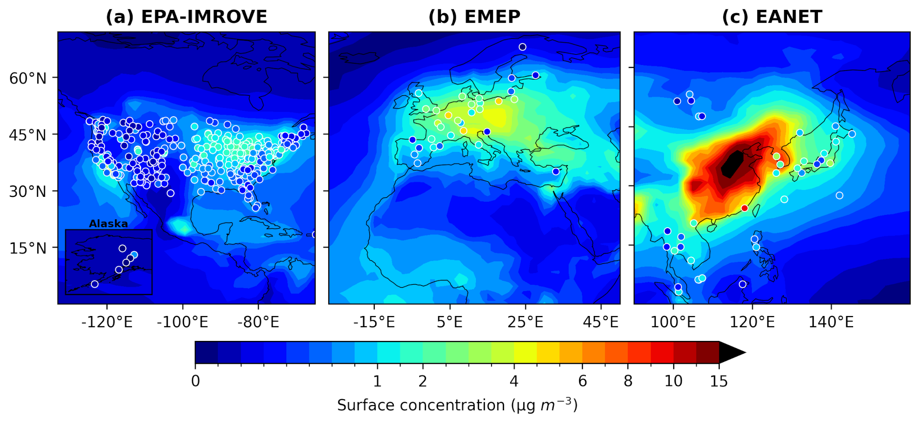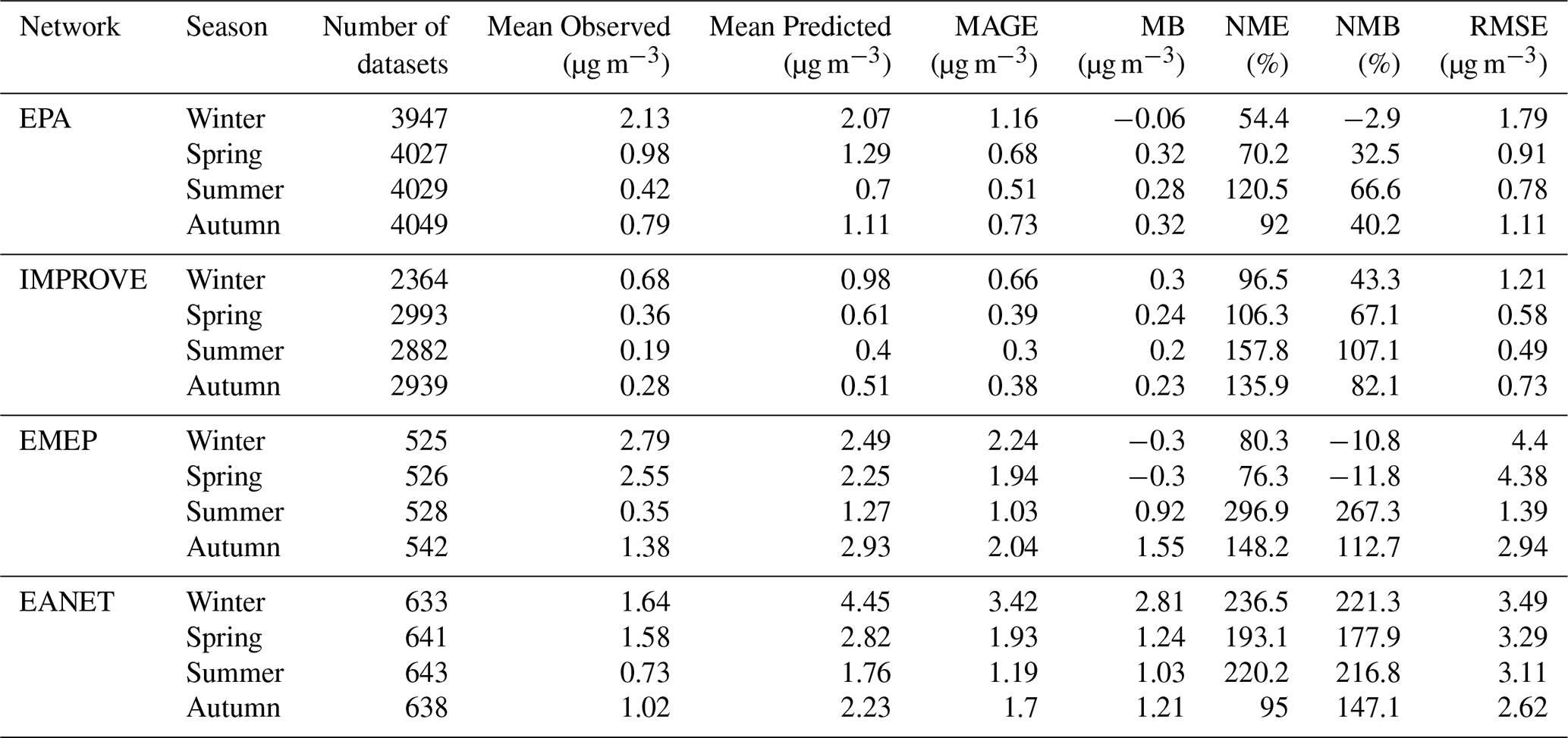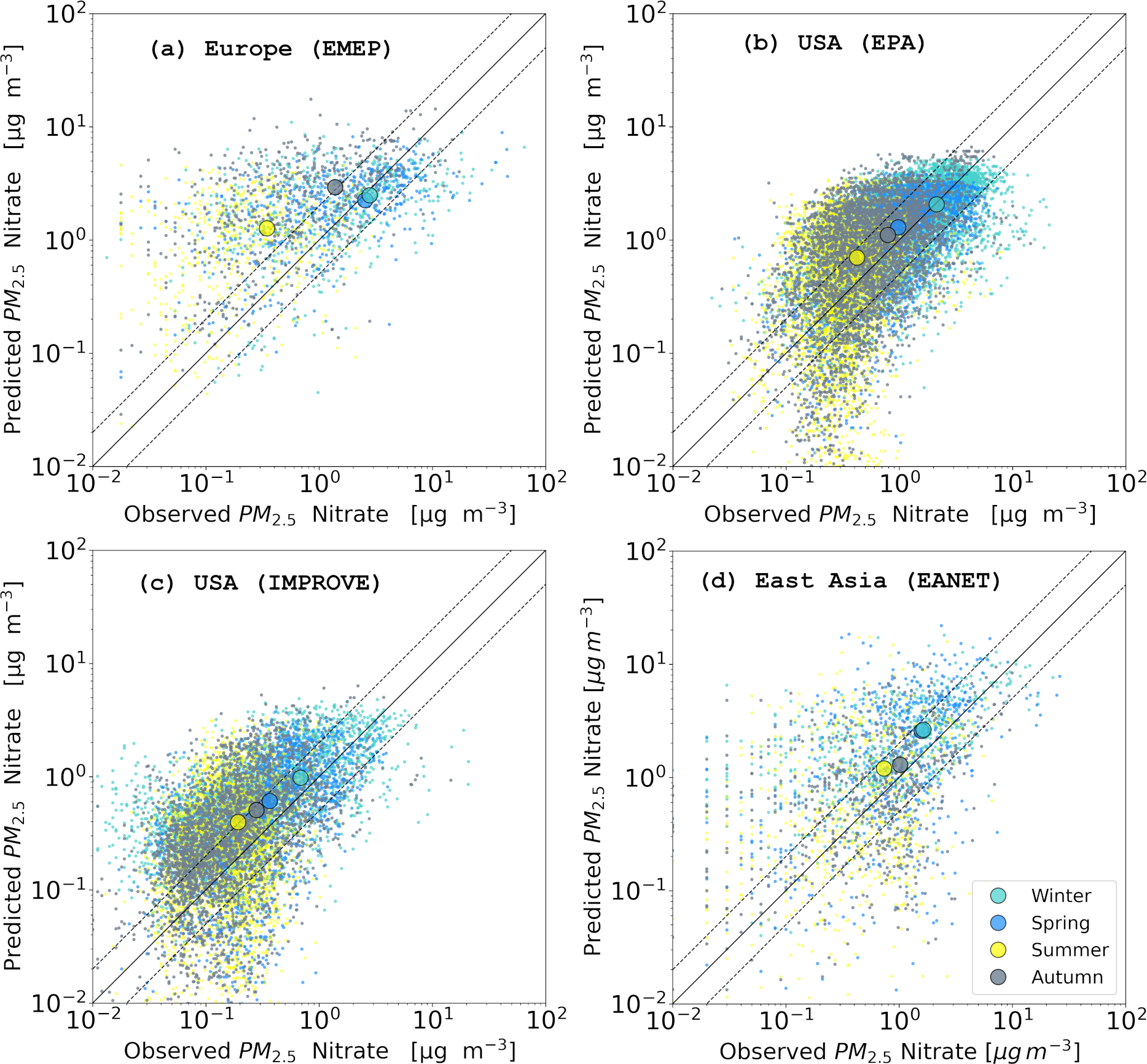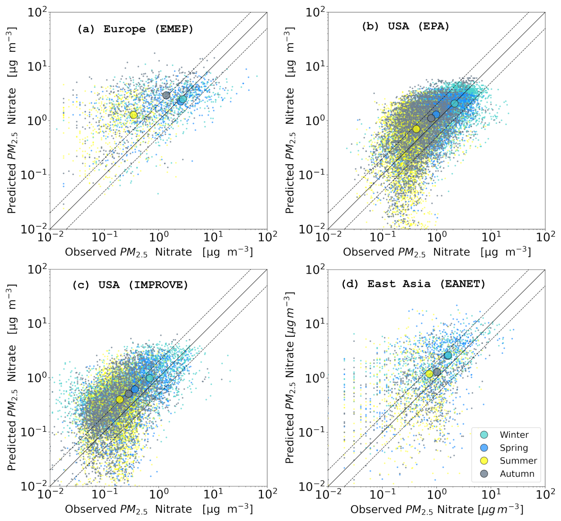 The PM2.5 aerosol observations of nitrate, sulfate, and ammonium are obtained from four networks that cover regions with the highest levels of anthropogenic activity in the polluted northern hemisphere. These networks include the EPA CASTNET network (U.S. Environmental Protection Agency Clean Air Status and Trends Network, 2026) and the IMPROVE network (Interagency Monitoring of Protected Visual Environments, 2026), which collectively encompass 152 stations for particulate nitrate across the United States. Notably, IMPROVE predominantly focuses on rural and remote regions, while EPA primarily covers urban areas. The EMEP network (European Monitoring and Evaluation Programme Air Pollutant Monitoring Data) includes nine stations for particulate nitrate, covering the European region. Additionally, the EANET network (The Acid Deposition Monitoring Network in East Asia, 2026) covers parts of East Asia with 33 stations. The locations of all stations can be found in Fig. S1a. The above networks provide monthly measurements for the entire period under consideration in this study. For PM2.5 nitrate measurements, a comparison with model predictions is presented in the form of surface concentration maps, where the observations from each station are overlaid on the model concentration maps (Fig. 2). Seasonal mean comparisons are shown as scatter plots in Fig. 3, while additional comparisons for sulfate and ammonium are presented in Figs. S15 and S16. Statistical evaluations of model performance are summarized in Table 2 for PM2.5 nitrate, and in Tables S13 and S14 for the remaining aerosol components. The metrics used are the same as for the precursor emissions evaluation described in Sect. 2.3.