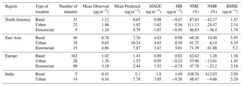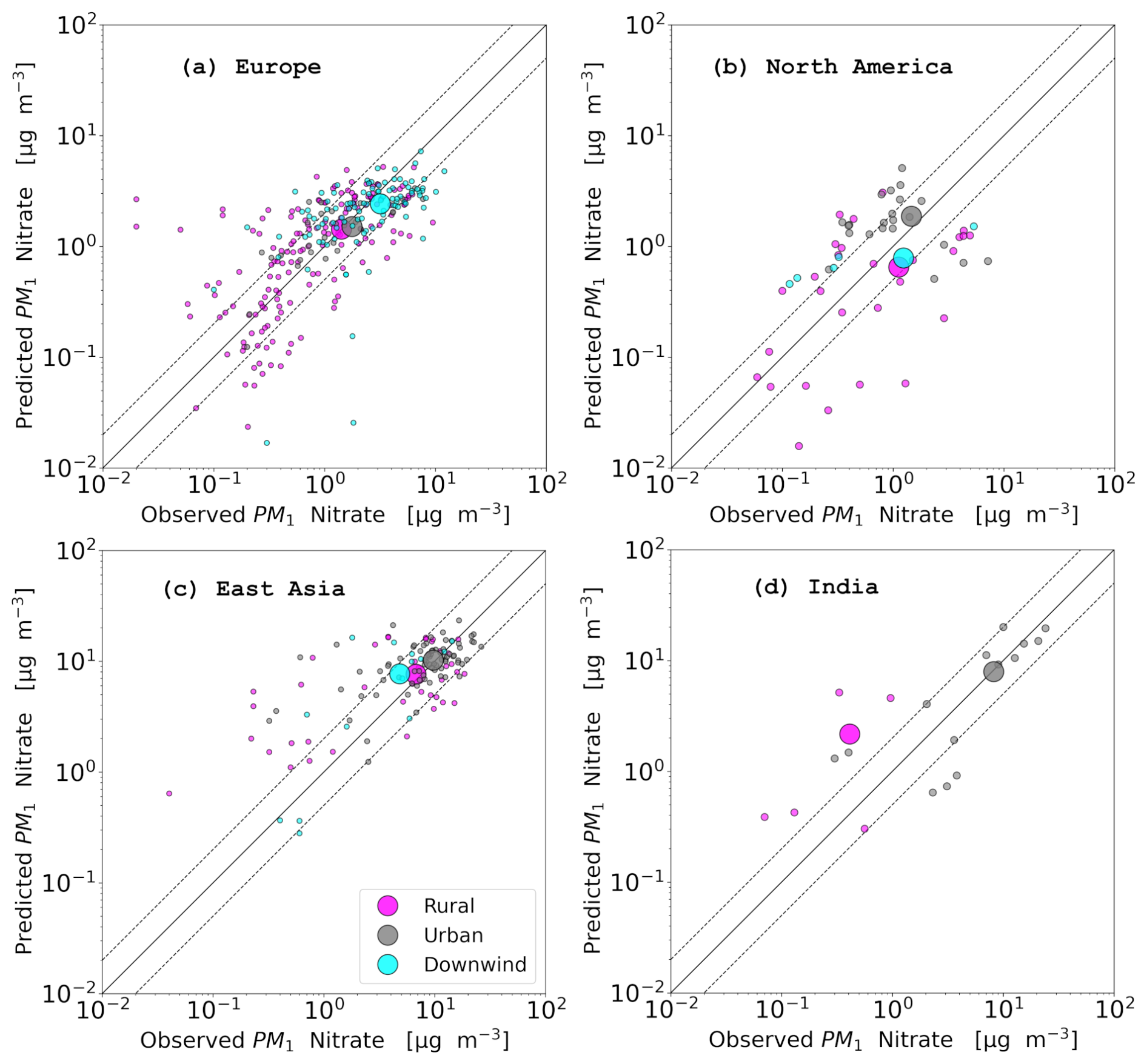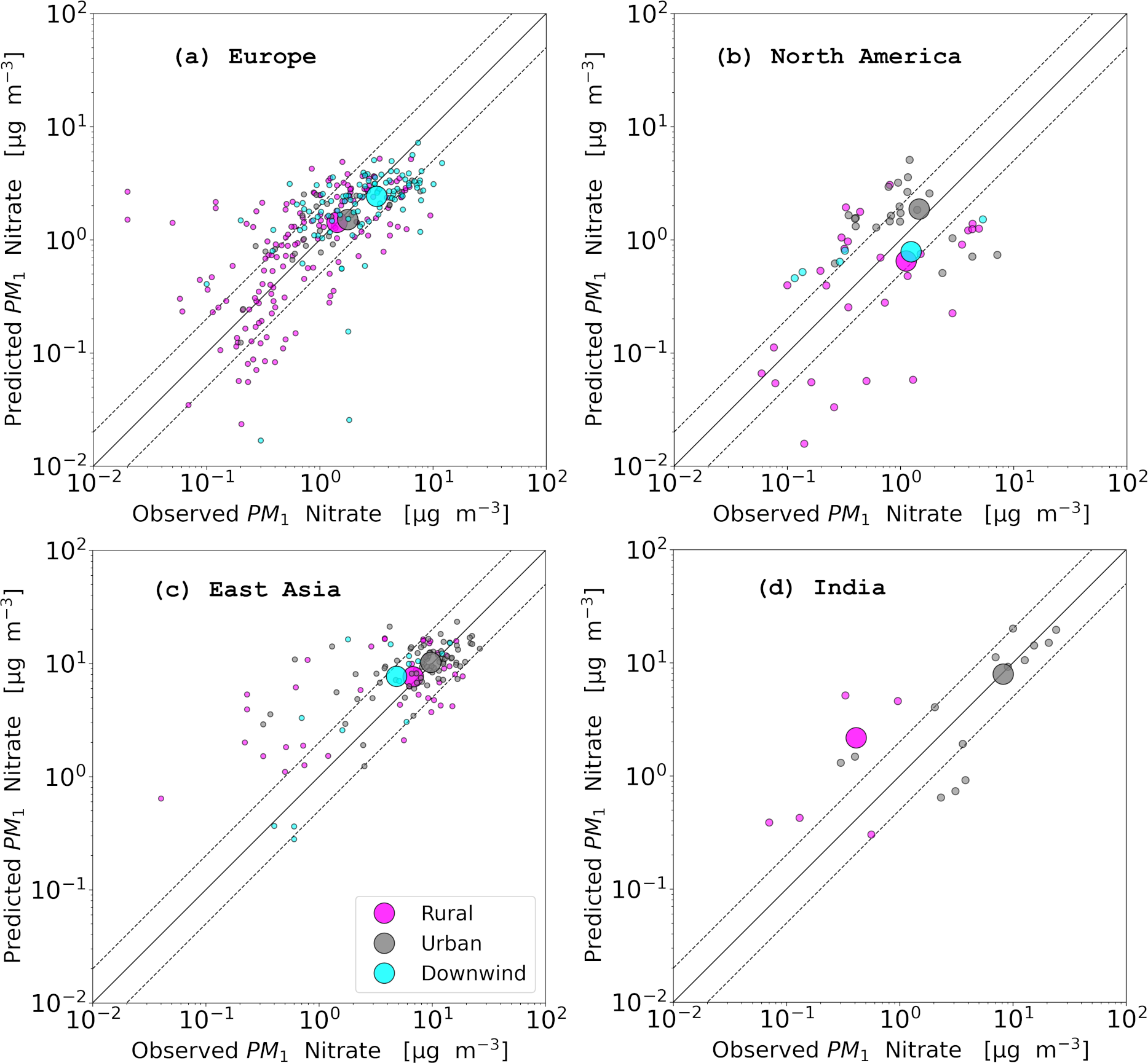 As shown in Fig. 4a, the model can reproduce the average PM1 values over rural and urban locations in Europe with a high accuracy, although there is considerable variation at specific locations. On the other hand, it underpredicts PM1 nitrate in urban-downwind locations (up to 50 %). In North America, the underprediction of average values is slightly stronger for urban-downwind and particularly for rural locations (Fig. 4b) with average values for urban sites showing better agreement. In East Asia, the model shows similar accuracy to Europe in urban and rural locations, but with a significantly lower number of outliers (Fig. 4c). However, the average urban-downwind values in this region exhibit an overprediction of slightly more than 50 %. In India, the model's estimation of average urban values aligns closely with measurements, while the model significantly overestimates average rural values by a factor of 4 (Fig. 4d).