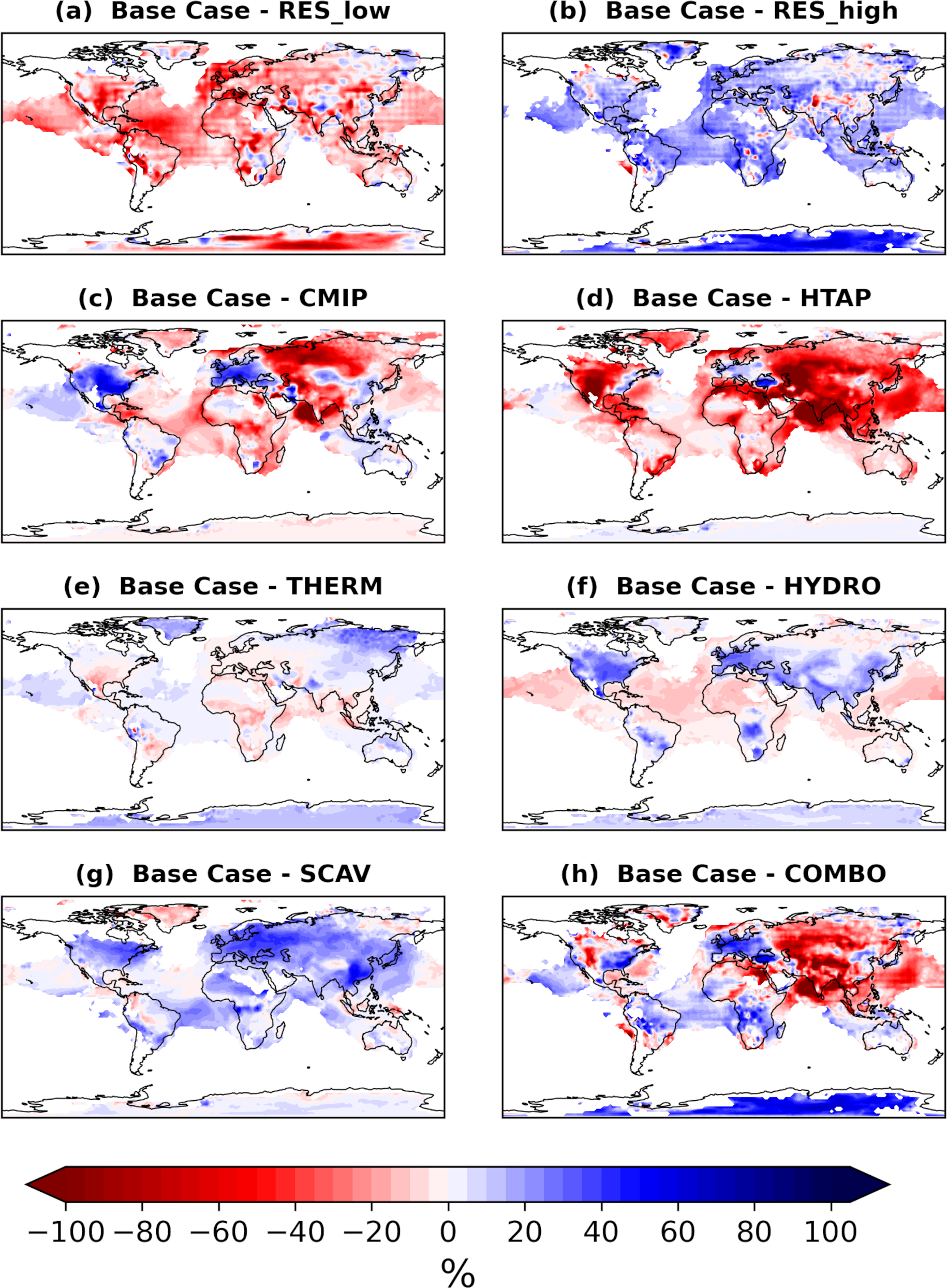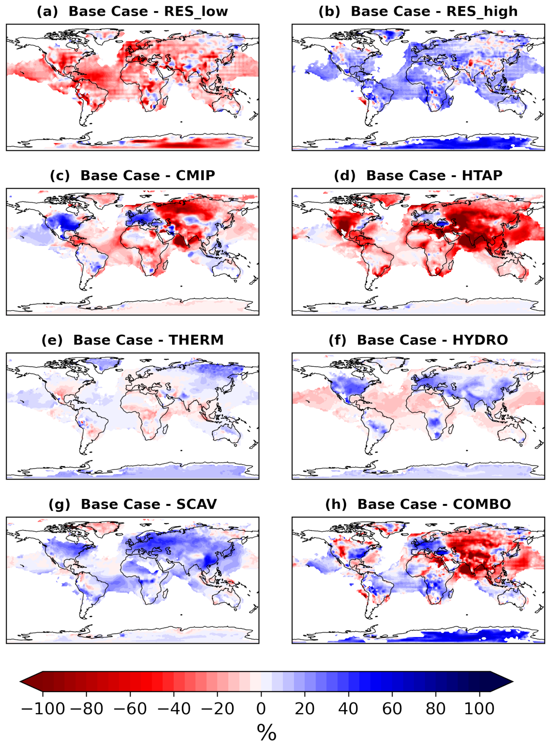 Figure 5Percentage changes of the EMAC-simulated average surface concentrations of PM2.5 NO3- for the period of 2010–2018 between the base case model run and the (a) “RES_low” case (b) “RES_high” case, (c) “CMIP” case, (d) “HTAP” case, (e) “THERM” case, (f) “HYDRO” case, (g) “SCAV” case and (h) “COMBO” case model runs. Negative values in red indicate higher concentrations by the respective sensitivity case and positive values in blue indicate the opposite.