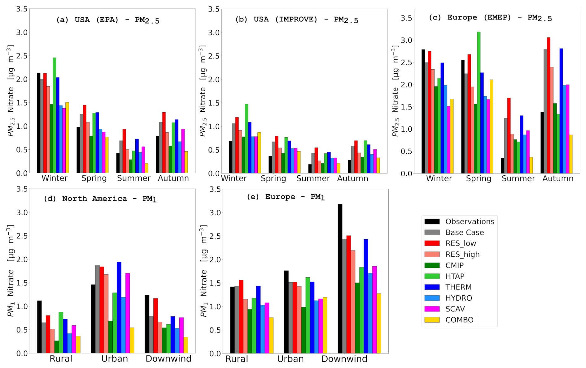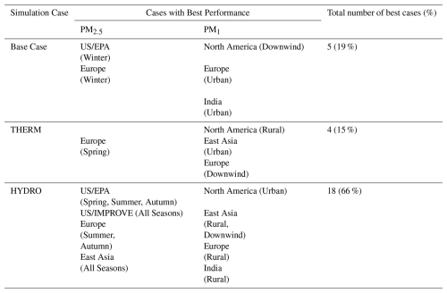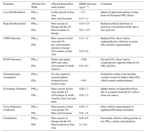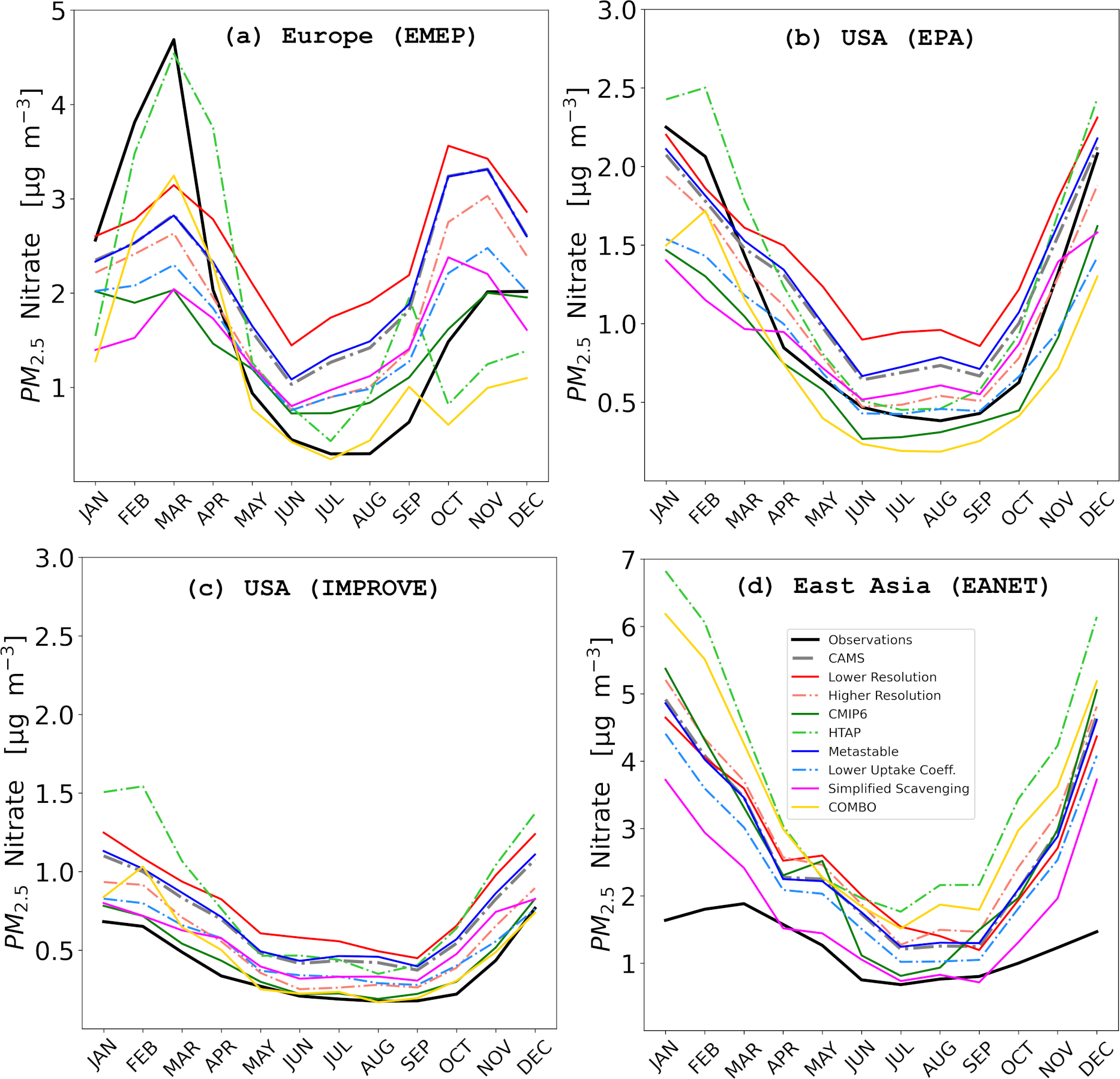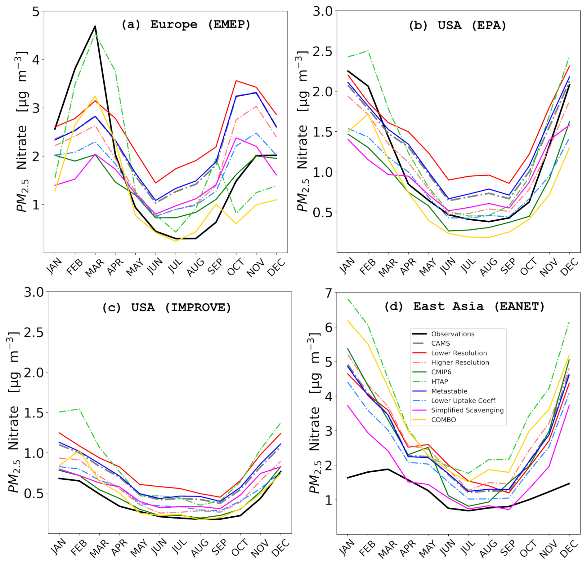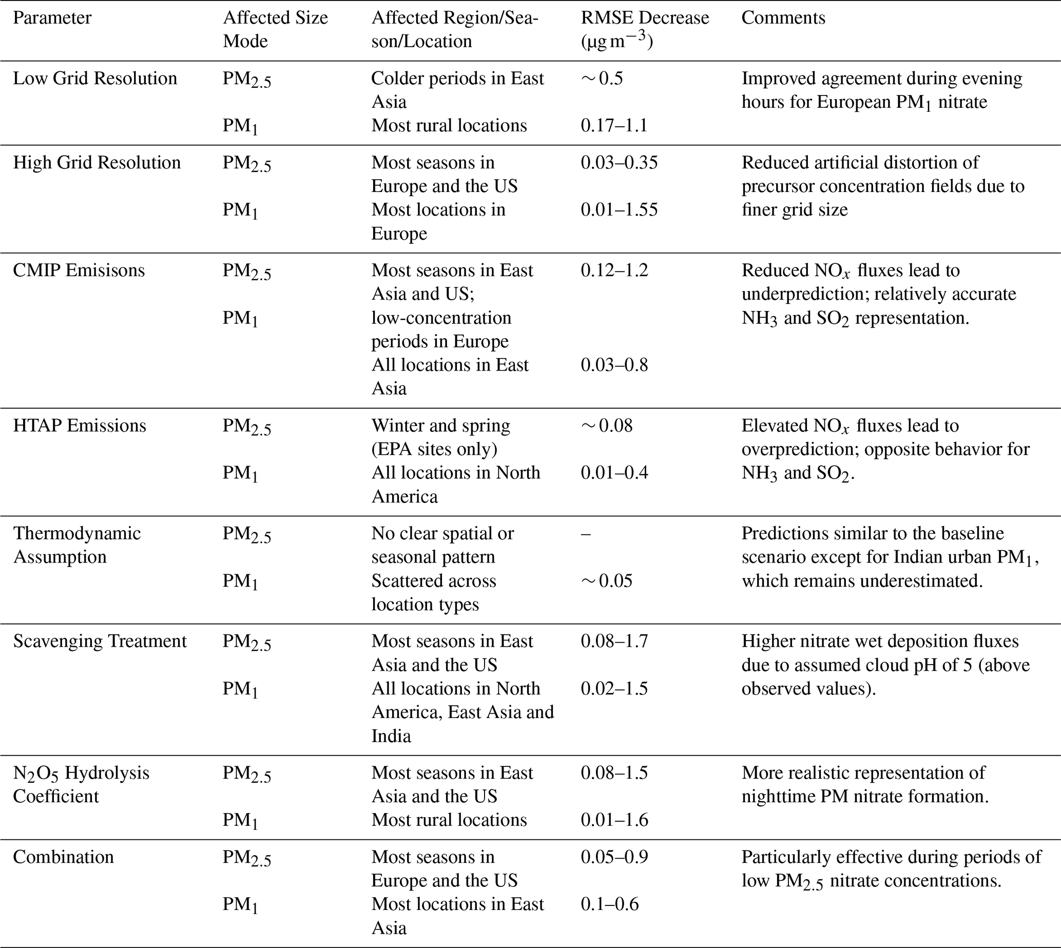 The final sensitivity simulation (COMBO) was developed to assess the cumulative impact of combining multiple parameter changes that had individually shown beneficial effects in previous sensitivity tests. Unlike the other simulations, which altered one parameter at a time, the COMBO setup was designed to explore whether integrating several favorable configurations would lead to improved overall model performance or reveal non-linear interactions. The initial COMBO configuration included the lower N2O5 uptake coefficient, higher spatial resolution, and the CMIP6 emission inventory, each selected based on their statistical performance. However, this combination resulted in unrealistically low nitrate PM concentrations, likely due to the low precursor emissions in CMIP6 (see Figs. S18 and S19 and Tables S31 and S32 in the Supplement), and was therefore excluded from the main analysis. The simplified scavenging scheme, despite its statistical improvements, was also omitted due to its unrealistic assumption of a fixed cloud and precipitation pH. The final COMBO configuration presented in this study includes the HYDRO case (with the lower N2O5 uptake coefficient for improved nighttime nitrate production), the RES_high case (for enhanced spatial resolution), and the HTAP emission inventory (which integrates global coverage with regional detail based on EDGARv6 and national inventories). This combination was selected not only for its statistical performance but also for its physical realism. The thermodynamic and scavenging treatments in the COMBO simulation remained consistent with those of the base case. The rationale behind each configuration choice is supported by the sensitivity results and corresponding performance metrics, as discussed in Sect. 4.5.