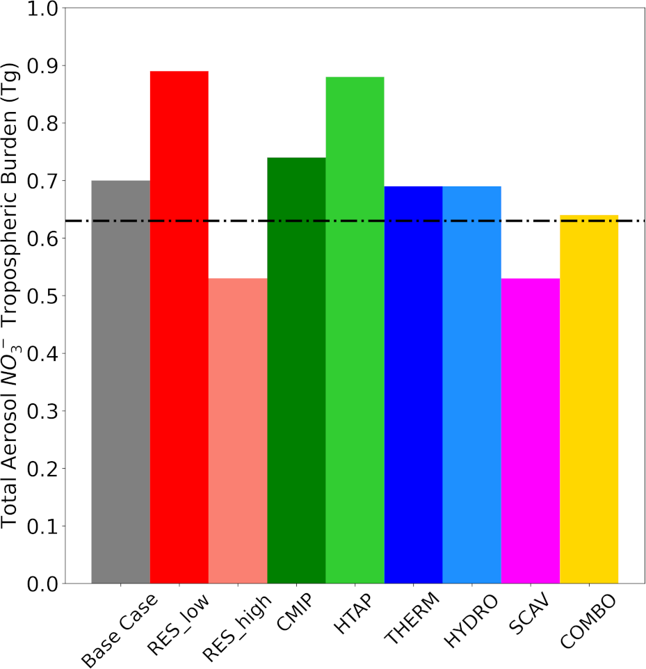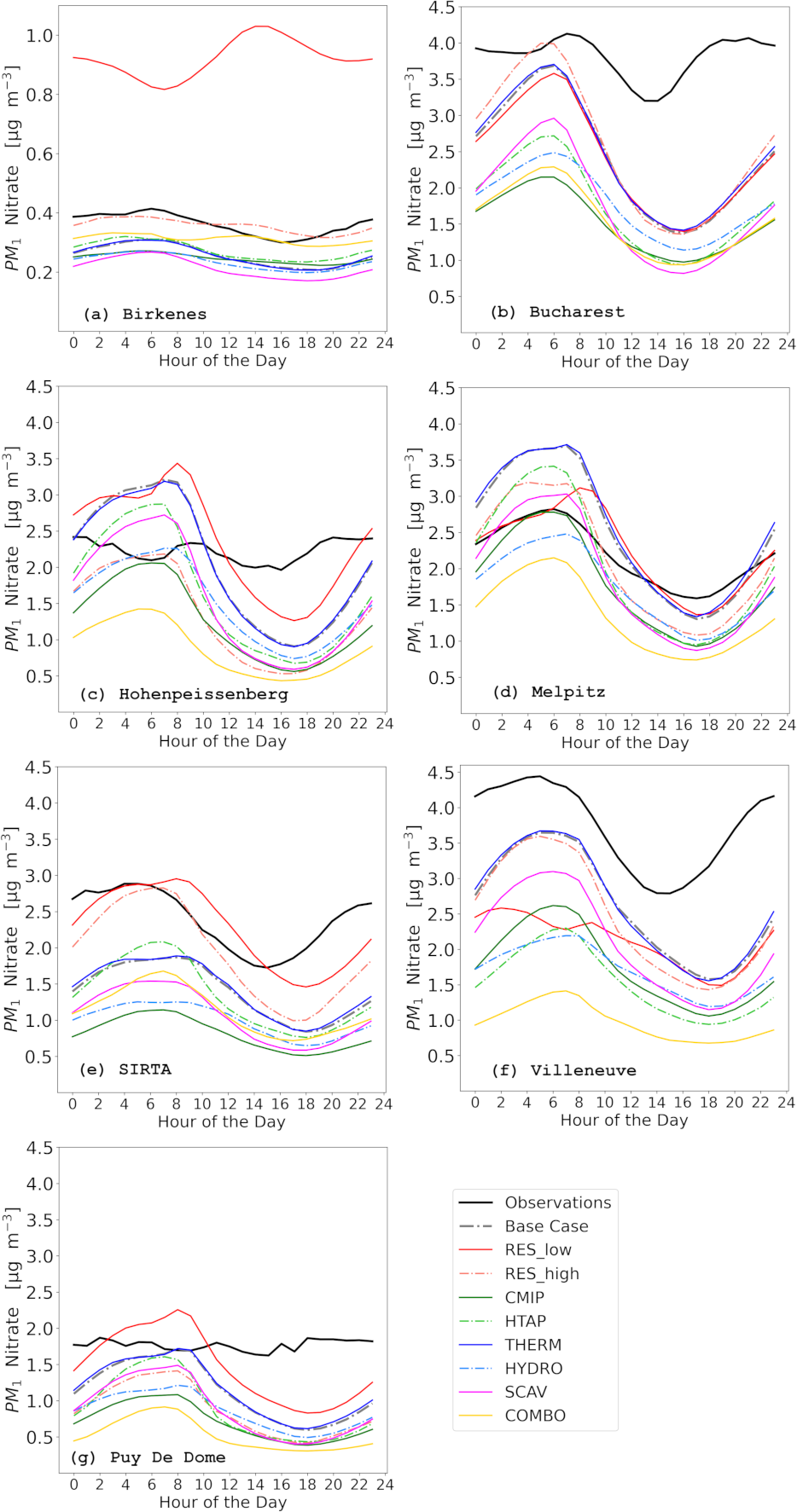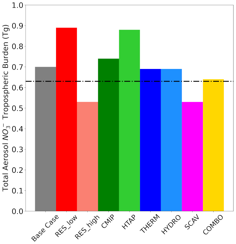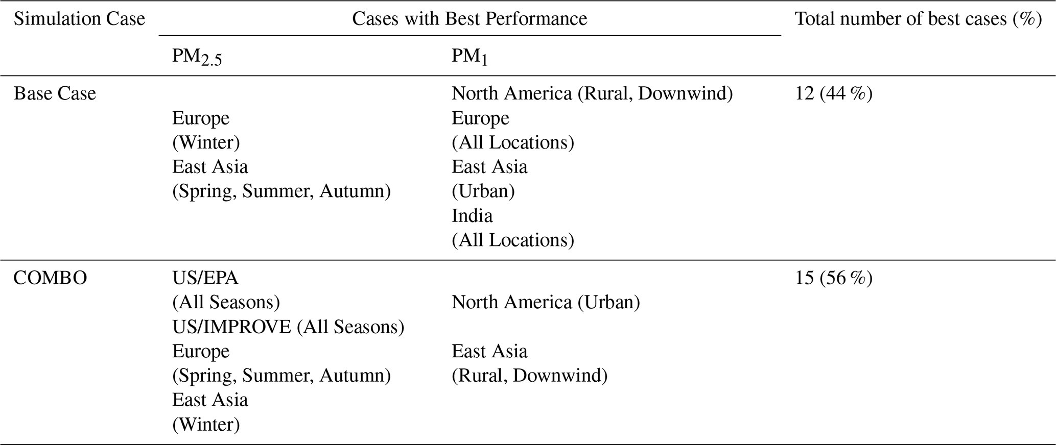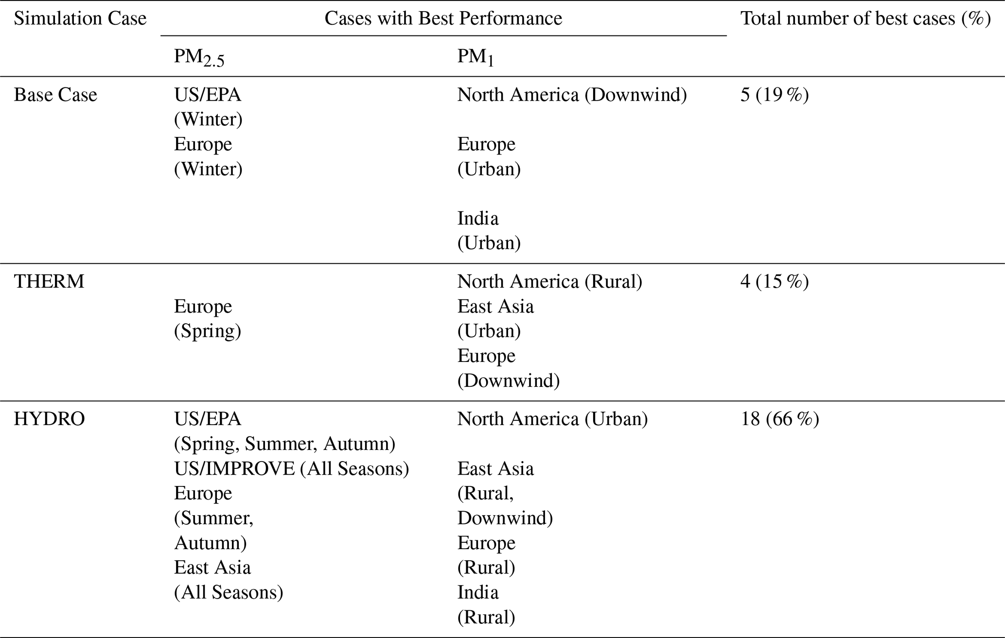 The final sensitivity simulation (COMBO) was developed to assess the cumulative impact of combining multiple parameter changes that had individually shown beneficial effects in previous sensitivity tests. Unlike the other simulations, which altered one parameter at a time, the COMBO setup was designed to explore whether integrating several favorable configurations would lead to improved overall model performance or reveal non-linear interactions. The initial COMBO configuration included the lower N2O5 uptake coefficient, higher spatial resolution, and the CMIP6 emission inventory, each selected based on their statistical performance. However, this combination resulted in unrealistically low nitrate PM concentrations, likely due to the low precursor emissions in CMIP6 (see Figs. S18 and S19 and Tables S31 and S32 in the Supplement), and was therefore excluded from the main analysis. The simplified scavenging scheme, despite its statistical improvements, was also omitted due to its unrealistic assumption of a fixed cloud and precipitation pH. The final COMBO configuration presented in this study includes the HYDRO case (with the lower N2O5 uptake coefficient for improved nighttime nitrate production), the RES_high case (for enhanced spatial resolution), and the HTAP emission inventory (which integrates global coverage with regional detail based on EDGARv6 and national inventories). This combination was selected not only for its statistical performance but also for its physical realism. The thermodynamic and scavenging treatments in the COMBO simulation remained consistent with those of the base case. The rationale behind each configuration choice is supported by the sensitivity results and corresponding performance metrics, as discussed in Sect. 4.5.