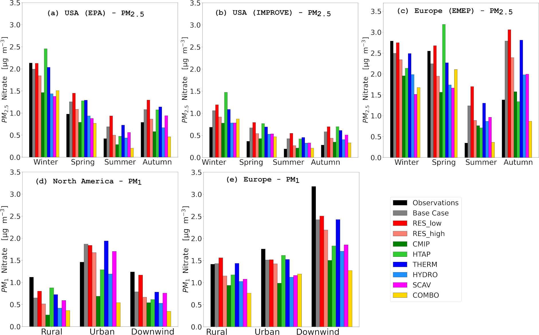 Figure 6Average seasonal surface concentrations of PM2.5 NO3- measured (black bars) and predicted from the base case and all sensitivity cases (colored bars) for the networks of (a) EPA, (b) IMPROVE and (c) EMEP during winter, spring, summer and autumn. Average PM1 NO3- surface concentrations measured by AMS instruments in field campaigns (black bars) and predicted by the base case and all sensitivity cases (colored bars) for the regions of (d) North America and (e) Europe divided into rural, urban and urban-downwind locations.