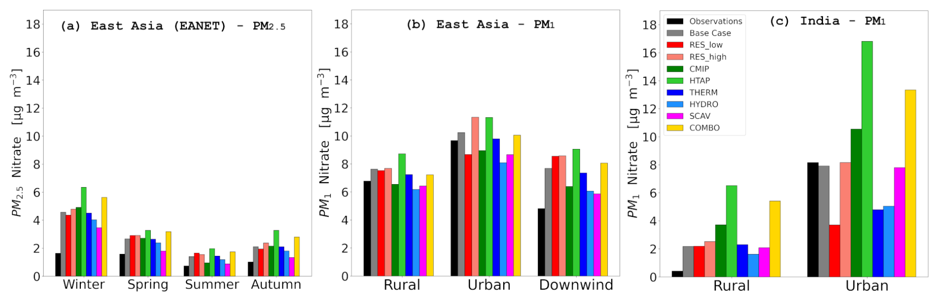 When evaluated against PM1 nitrate concentrations from AMS field campaigns, HTAPv3 shows nearly 20 % underprediction at rural sites in Europe and a 40 % underprediction at urban-downwind locations (Fig. 6d). Nevertheless, this configuration performs well in urban areas across Europe and in both rural and urban locations in North America, showing the best agreement with observations and improved statistical performance compared to the base case (Fig. 6e, Table S22). However, urban-downwind sites in the US remain significantly underpredicted, with discrepancies approaching 50 %, similar to the base case. In East Asia and India, the HTAPv3 simulation struggles to reproduce observations, showing the highest overpredictions among all model configurations across all site types (Fig. 7b, c). In India, the overprediction is particularly severe, reaching up to a factor of 15 in rural areas, despite NH3 emissions being underestimated on average (Fig. S10c). This is likely due to the rural campaign sites coinciding with NH3 emission hotspots, which are elevated even compared to the CAMS inventory (Fig. S14f). In urban areas, predicted concentrations are approximately twice the observed value, driven by the overestimation of NOx emissions (Fig. S7c).