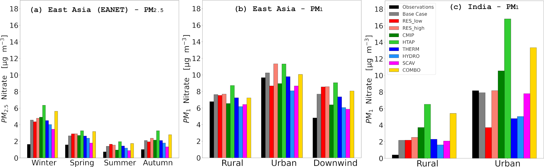 Figure 7Average seasonal surface concentrations of PM2.5 NO3- measured (black bars) and predicted from the base case and all sensitivity cases (colored bars) for the network of (a) EANET during winter, spring, summer and autumn. Average PM1 NO3- surface concentrations measured by AMS instruments in field campaigns (black bars) and predicted by the base case and all sensitivity cases (colored bars) for the regions of (a) East Asia and (b) India divided into rural, urban and urban-downwind locations.