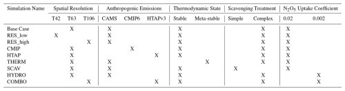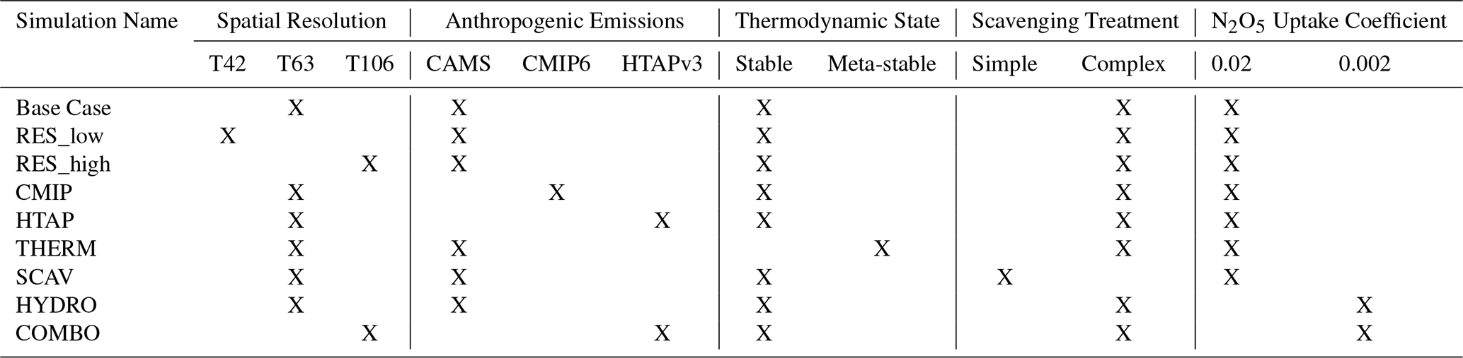 An additional sensitivity model run was performed in which only the thermodynamic state of the aerosol was altered (THERM). In this run, the metastable assumption was implemented, meaning aerosols are prevented from forming solids, even at extremely low RH values, allowing them to persist in a supersaturated aqueous phase. Additionally, a sensitivity model run was conducted in which only the scavenging treatment was modified (SCAV) employing a simplified mechanism where the gas-to-particle phase partitioning follows the effective Henry's Law coefficients approach. Furthermore, aqueous phase chemistry, specifically the oxidation of sulfur from S(IV) to S(VI), was not considered in the calculation of cloud acidity. Instead, a fixed pH value of 5 was prescribed for both in-cloud and precipitation conditions (Tost et al., 2007b). This value is based on observational data from hill-cap and orographic clouds across the U.S., Europe, and other regions, which report pH values ranging from approximately 3.6 to 7, with many clustered around 5 (Feinberg et al., 2019). While not perfect, a pH of 5 serves as a reasonable mid-range estimate in cases where a full dynamic cloud chemistry treatment is not computationally feasible. We emphasize, however, that this fixed pH assumption is applied only in the “SCAV” sensitivity test. In all other simulations, cloud and precipitation pH is calculated interactively at each model time step based on comprehensive chemical speciation and dissociation reactions.