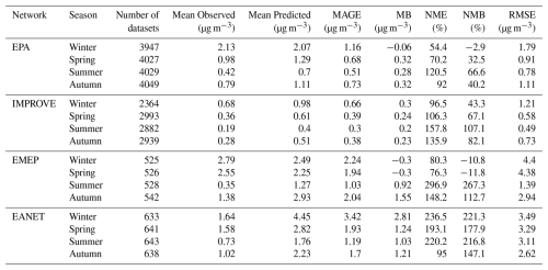 Table 2Seasonal statistical evaluation of EMAC simulated PM2.5 NO3- surface concentrations from the base case against observations during 2010–2018. The metrics used include the Mean Absolute Gross Error (MAGE), Mean Bias (MB), Normalized Mean Error (NME), Normalized Mean Bias (NMB) and Root Mean Square Error (RMSE).