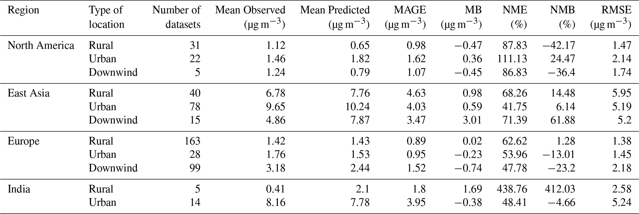 The aerosol observations of PM1 are derived from AMS measurements obtained during field campaigns in the Northern Hemisphere from 2010 to 2018. The measurement durations of these campaigns ranged from one to six months and included rural, urban, and urban-downwind locations. The campaign and types of locations can be seen in Fig. S1b. Further details regarding the locations of the field campaigns, including their duration, can be found in Tsimpidi et al. (2016, 2025). As the field observations (in contrast to the network measurements) are not continuous but rather fragmented into different time periods for each field campaign location, the comparison is presented in the form of scatter plots that compare the model and the measured values depending on the location type (see Fig. 4). A scatter plot comparison of the seasonal means is shown in Fig. S17. The statistical evaluation involves the regions of the USA, East Asia, Europe, and India, using the same metrics as above. The results are presented in Table 3.