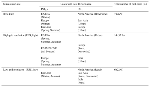 For PM1 nitrate concentrations, the lower-resolution simulation improves the underprediction bias of the base case over rural locations in North America (Fig. 6d). While similar improvements are observed at urban-downwind sites, this comes at the cost of substantially higher MAGE and NME values (Table S16). When evaluating overall model performance using the RMSE, the base case performs better in urban-downwind regions of North America. Similarly, in urban and urban-downwind locations across Europe the lower-resolution case slightly reduces mean bias, but the improvement is offset by significantly elevated MAGE and NME scores (Table S16), resulting in poorer overall performance compared to the base case. The RES_low configuration also fails to improve predictions over rural European sites (Fig. 6e). In contrast, model predictions over rural locations in East Asia and India are improved by the lower-resolution simulation, while performance over urban areas in these regions deteriorates (Fig. 7b and c). Overall, the use of a lower grid resolution proves to be more effective for simulating PM1 nitrate concentrations over rural locations (Table 4), but performs worse over urban sites, as indicated by most statistical metrics (Table S16).