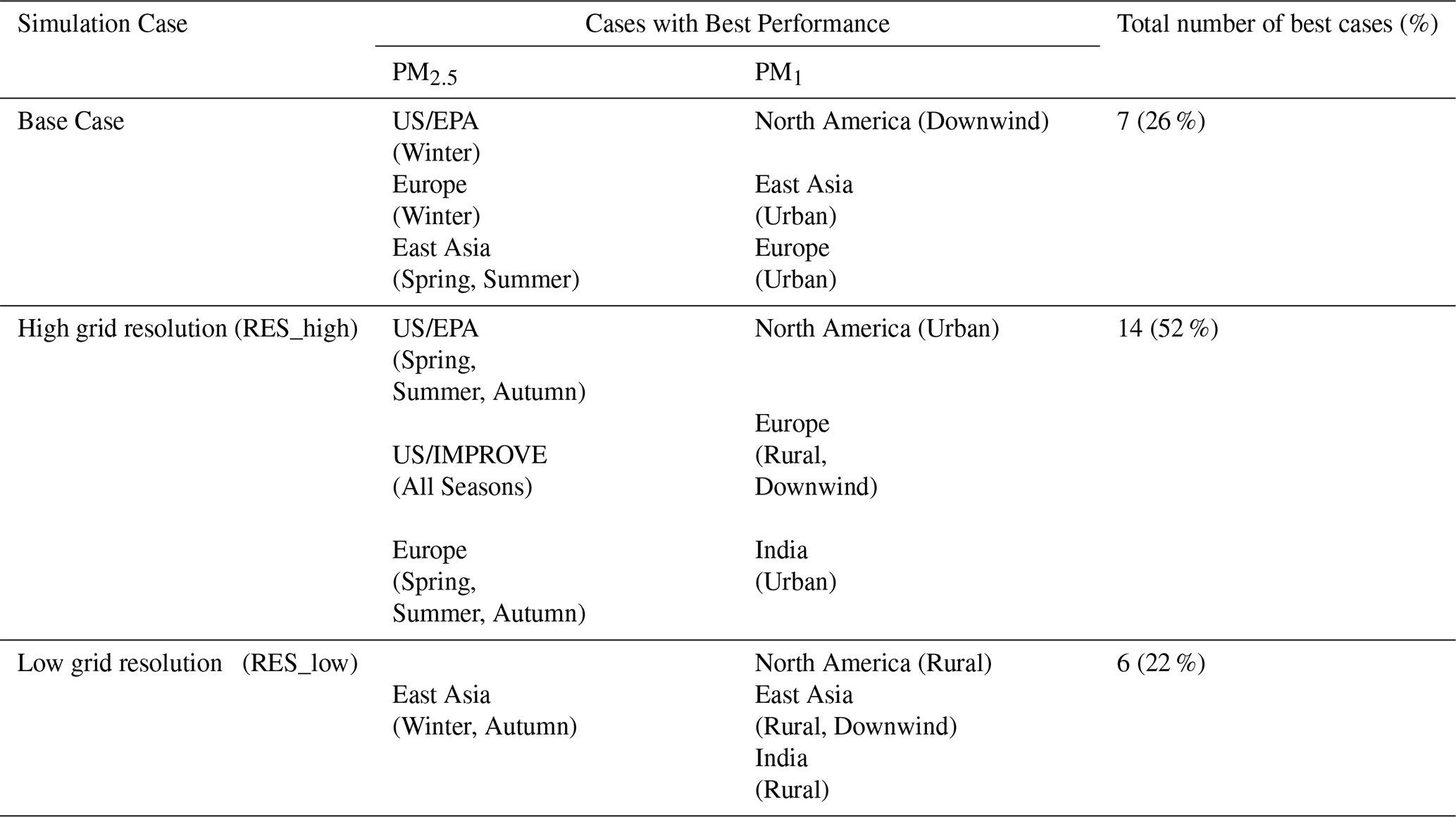 The statistical ranking among the three simulations utilizing different grid resolutions reveals that the higher resolution case dominantly outperforms the other two concerning accurate PM2.5 nitrate predictions over most regions and seasons (Table 4). Concerning the accuracy of the PM1 predictions on the other hand, the statistical ranking is evenly spread among the three configurations with the use of a lower grid resolution providing higher agreement with the observations over rural locations, while the higher grid resolution improves the performance mostly over urban locations (Table 4).