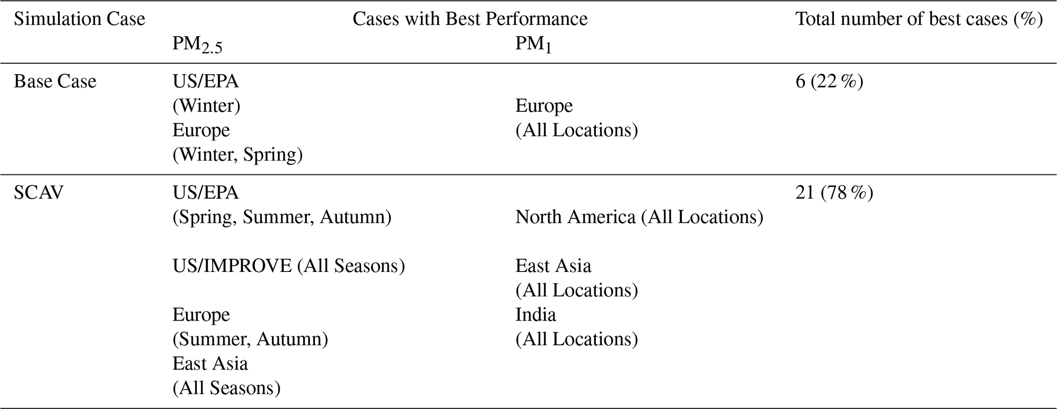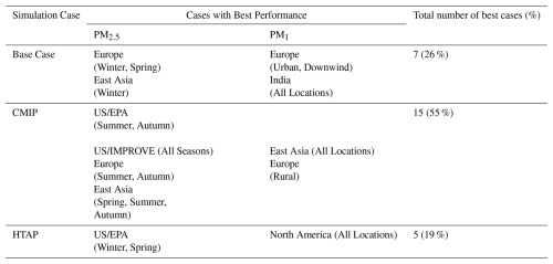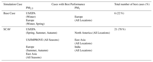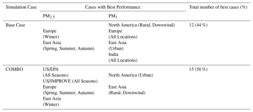 Seasonal comparisons of PM2.5 concentrations, as well as PM1 concentrations across different types of measurement sites, are presented in Figs. 6 and 7, respectively, with results grouped by region and expressed in terms of mean bias relative to observations. Additionally, the performance of each sensitivity simulation is directly compared to the base case in terms of its ability to more accurately reproduce PM2.5 and PM1 concentrations across all examined regions, seasons, and site types. The ranking is based on root mean square error (RMSE), which provides a robust measure of model performance by accounting for both bias and variance. These rankings are summarized in Tables 4–8, while full statistical results for each sensitivity test are available in Tables S15–S30.