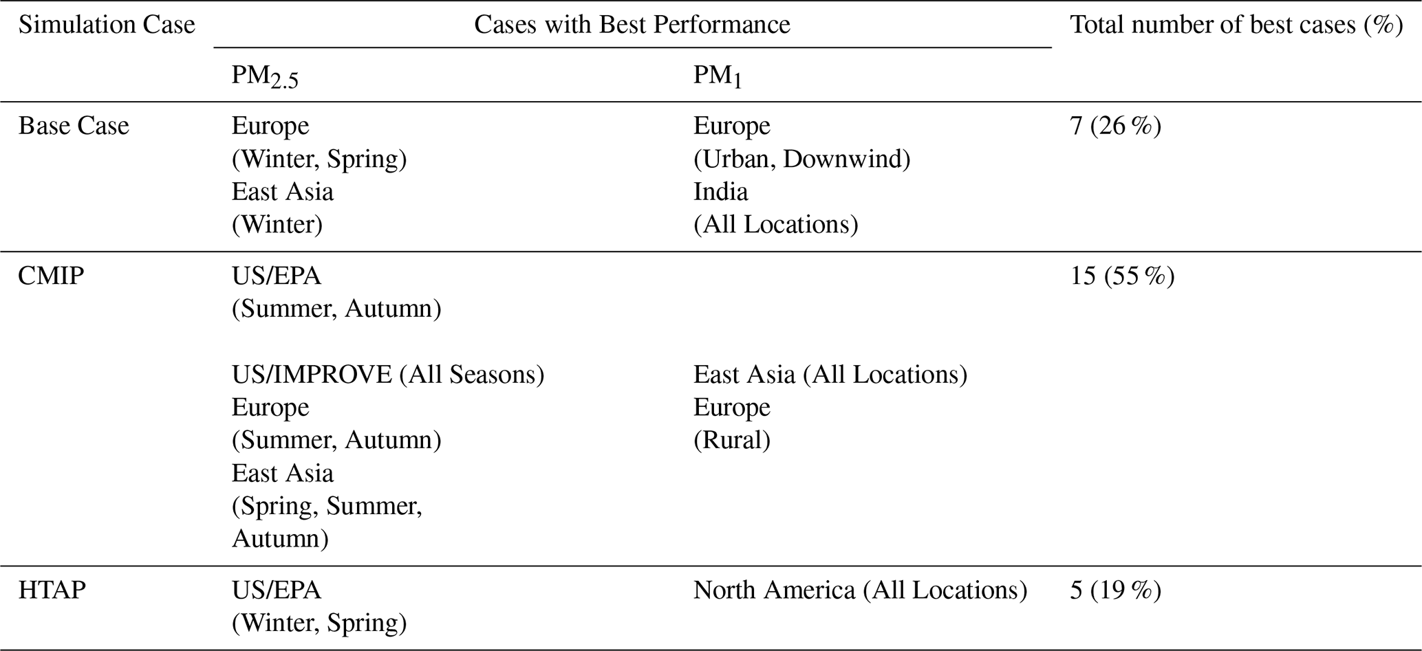 A statistical comparison of the configurations using different anthropogenic emission inventories shows that CMIP6 provides the highest overall accuracy for PM2.5 predictions (Table 5). However, its performance during winter is relatively weak, being outscored in three of the four observational networks. No consistent pattern emerges regarding observational site types in the PM1 prediction accuracy, but at the same time each database clearly displays distinct regional strengths. Specifically, CAMS performs best in Europe and India, CMIP6 in East Asia and HTAPv3 in North America.