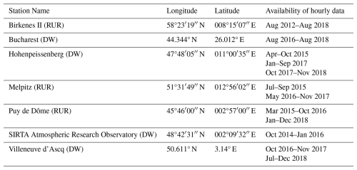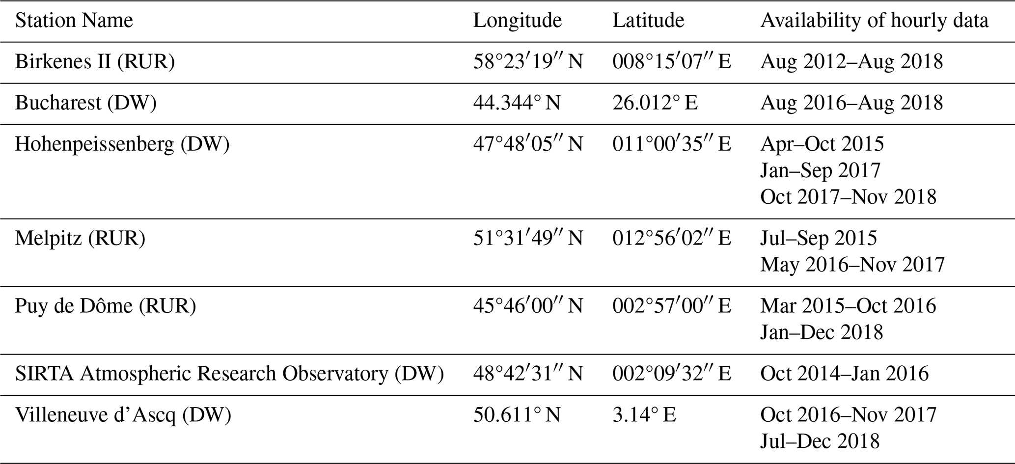 Table 3Statistical evaluation of EMAC simulated PM1 NO3- surface concentrations from the base case against observations during 2010–2018. The metrics used include the Mean Absolute Gross Error (MAGE), Mean Bias (MB), Normalized Mean Error (NME), Normalized Mean Bias (NMB) and Root Mean Square Error (RMSE).
