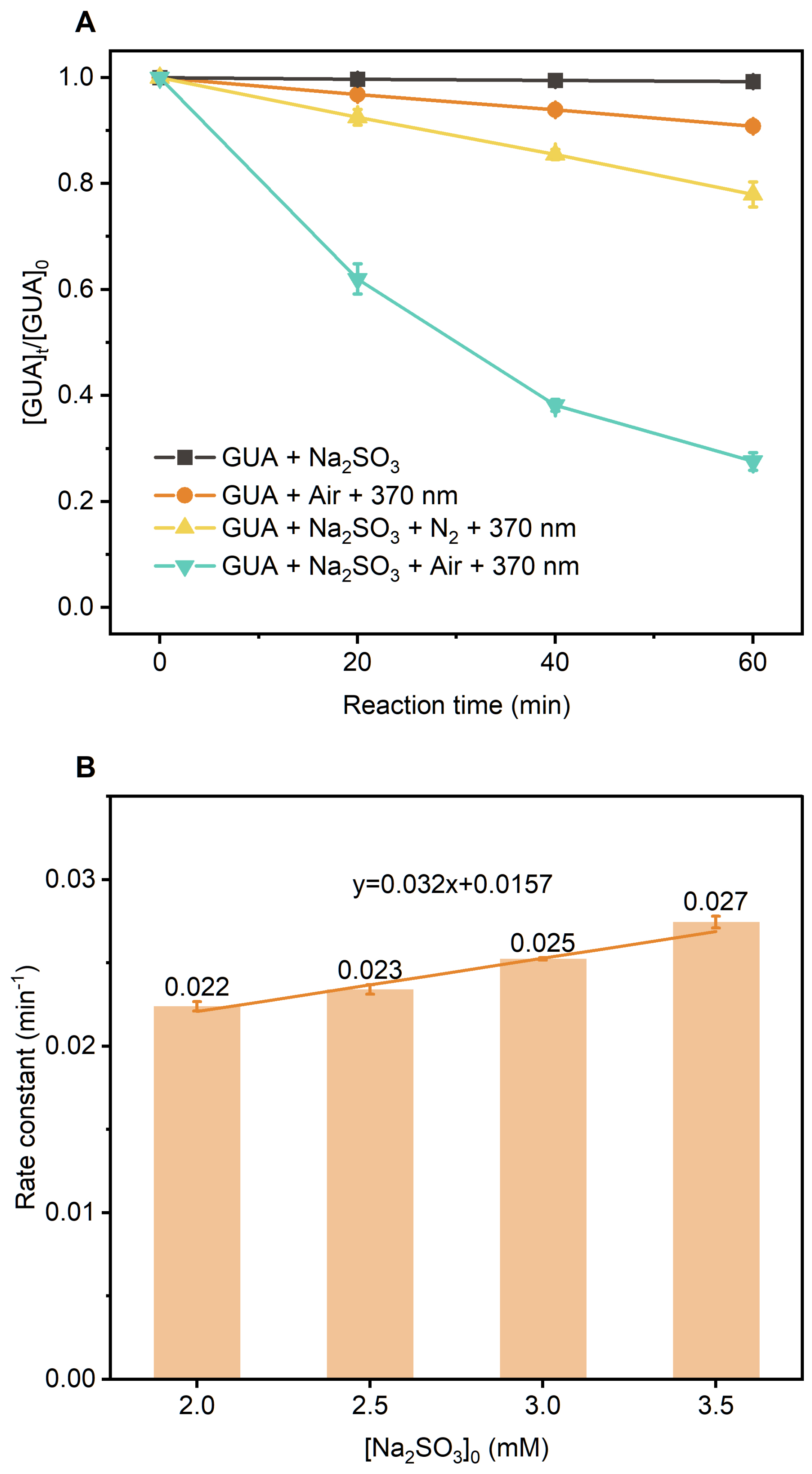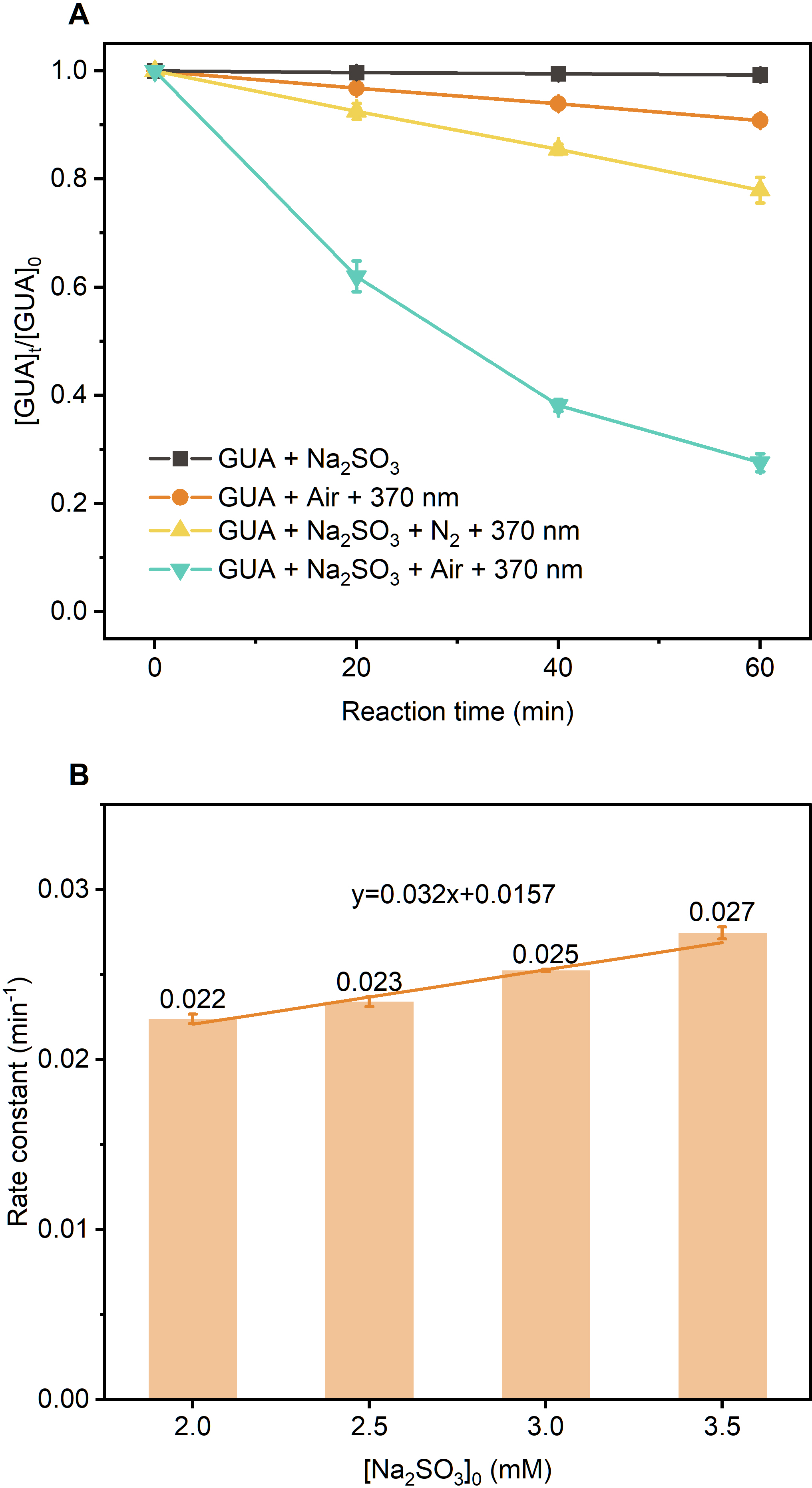 To investigate the photodegradation of GUA in sodium sulfite (Na2SO3) solutions under UVA irradiation, we first examined the photooxidation behavior of Na2SO3 in the UVA region. Na2SO3 solutions with controlled initial pH were prepared and continuously bubbled with zero air (Fig. S5). At pH 4.0 and 0.5 mM Na2SO3, sulfite loss in the dark was slow, with an observed rate constant of 2.27×10-5s−1 (Fig. S6) (Brandt and van Eldik, 1995). Under UVA irradiation (370 nm), the sulfite loss rate increased nearly tenfold to 2.02×10-4s−1, with sulfate (SO42-) as the primary product (Fig. S7). Increasing Na2SO3 concentration to 2.0 mM had only a moderate effect, with rate constants averaging (2.41 ± 0.79) ×10−4s−1 (Figs. S8 and S9). In contrast, pH significantly influenced photooxidation kinetics (Fig. S10): the apparent sulfite decay rate increased by nearly 14-fold from pH 4.0 to 7.0, reflecting shifts in dominant S(IV) species (HSO3- vs. SO32-) with different photochemical reactivities. These findings demonstrate that UVA light substantially enhances S(IV) oxidation in metal-free systems and that the reaction is strongly pH-dependent.