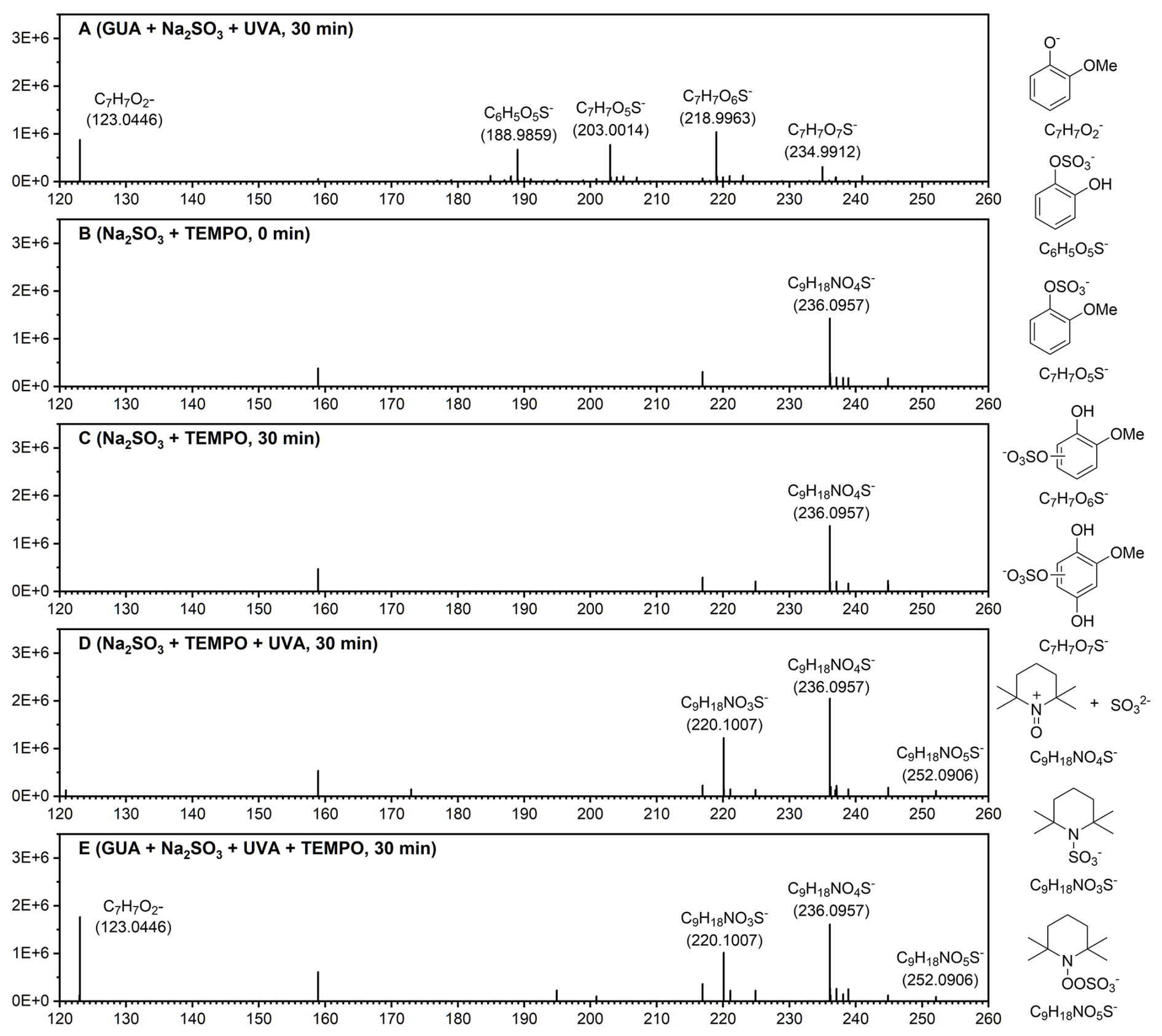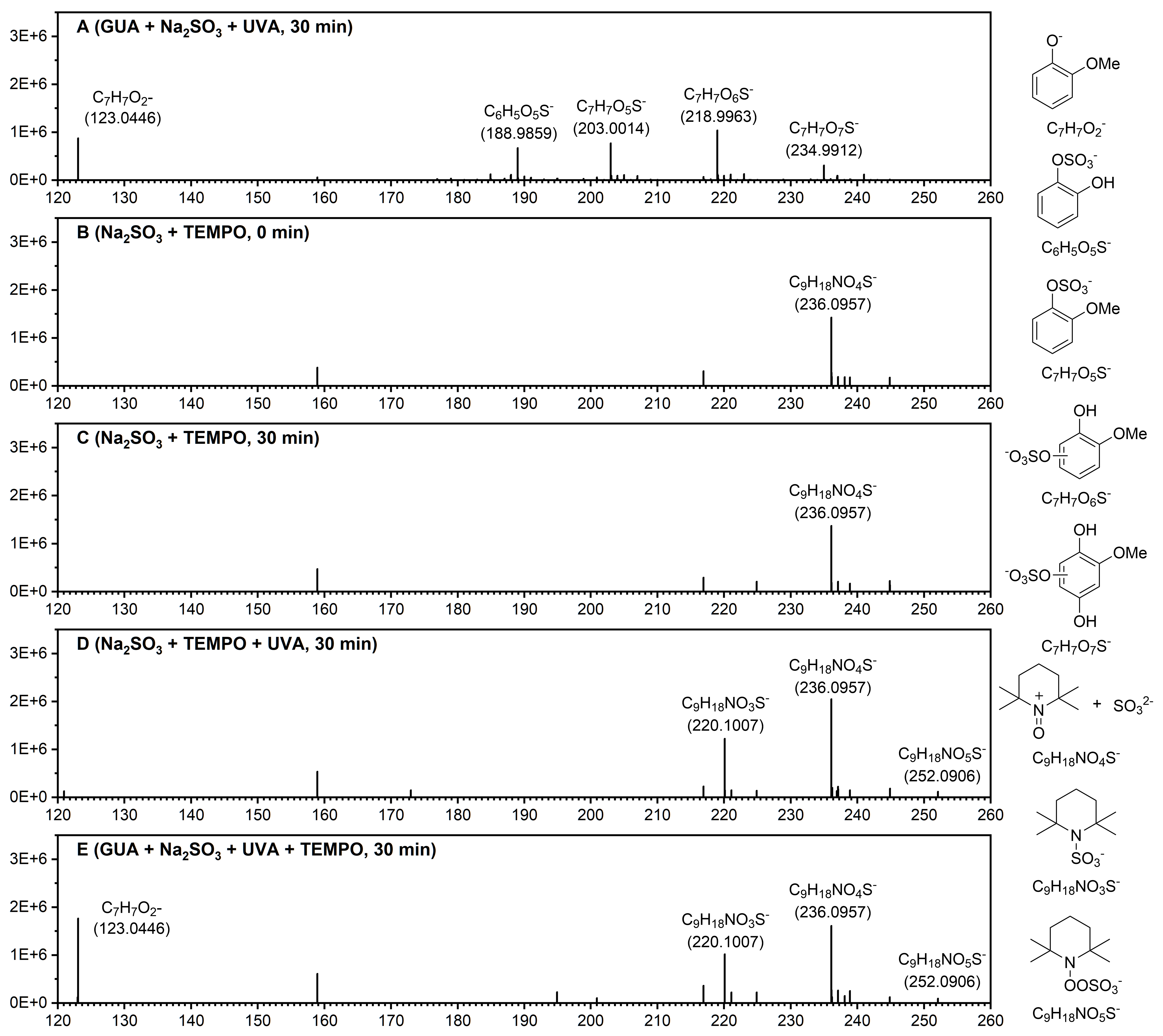 Figure 2High-resolution mass spectra of reaction products from: (a) GUA+Na2SO3 under after 30 min of 370 nm irradiation; (b) Na2SO3+TEMPO at 0 min; (c) Na2SO3+TEMPO after 30 min in the dark; (d) Na2SO3+TEMPO after 30 min of 370 nm irradiation; and (e) GUA+Na2SO3+TEMPO after 30 min of 370 nm irradiation. Experimental conditions: [guaiacol]=0.1 mM, [Na2SO3]=2.0 mM, [TEMPO]=4.0 mM, pH=4.0± 0.1, zero-air bubbling, and room temperature. Proposed chemical structures corresponding to the key mass spectral peaks are shown to the right of the spectra.