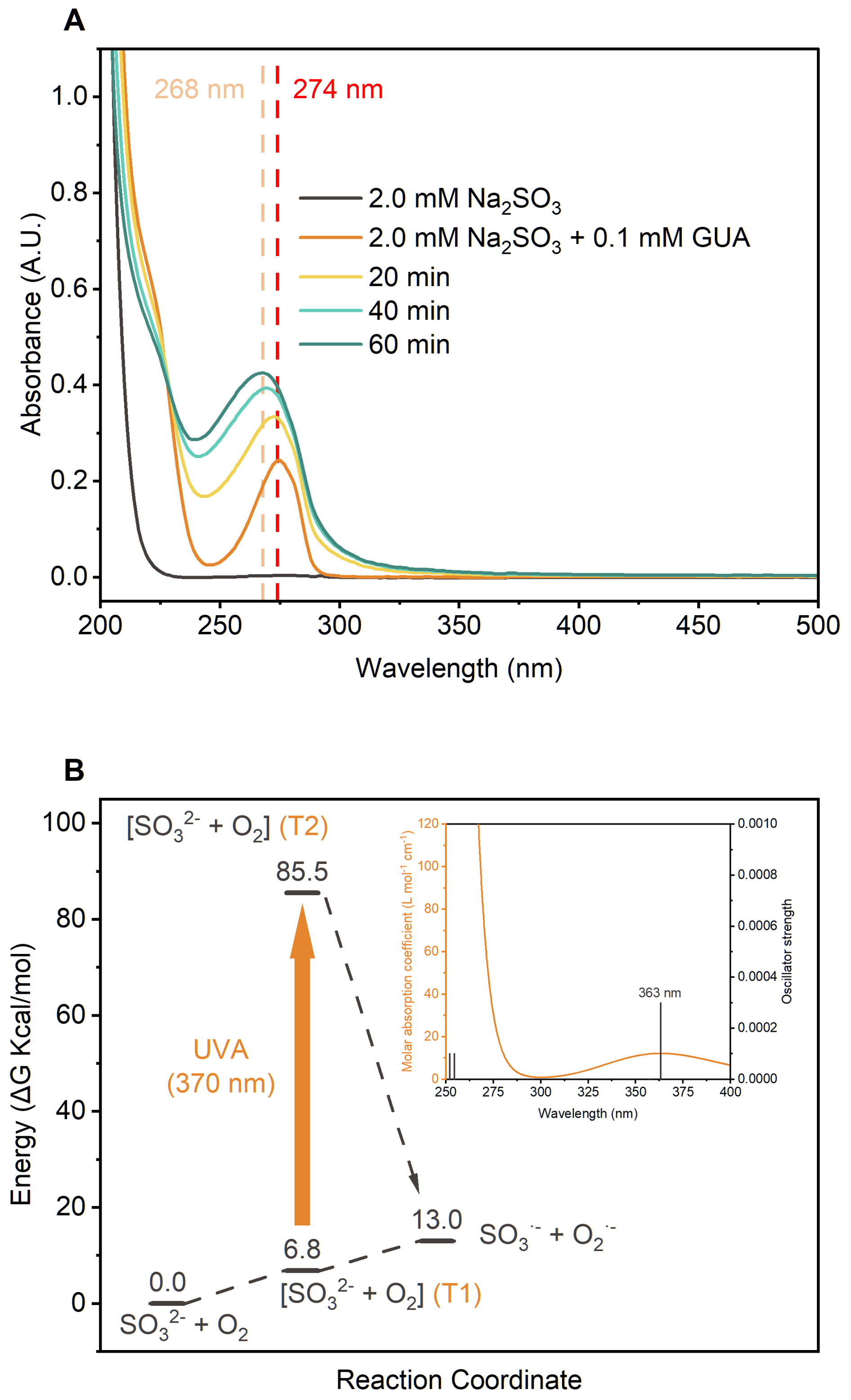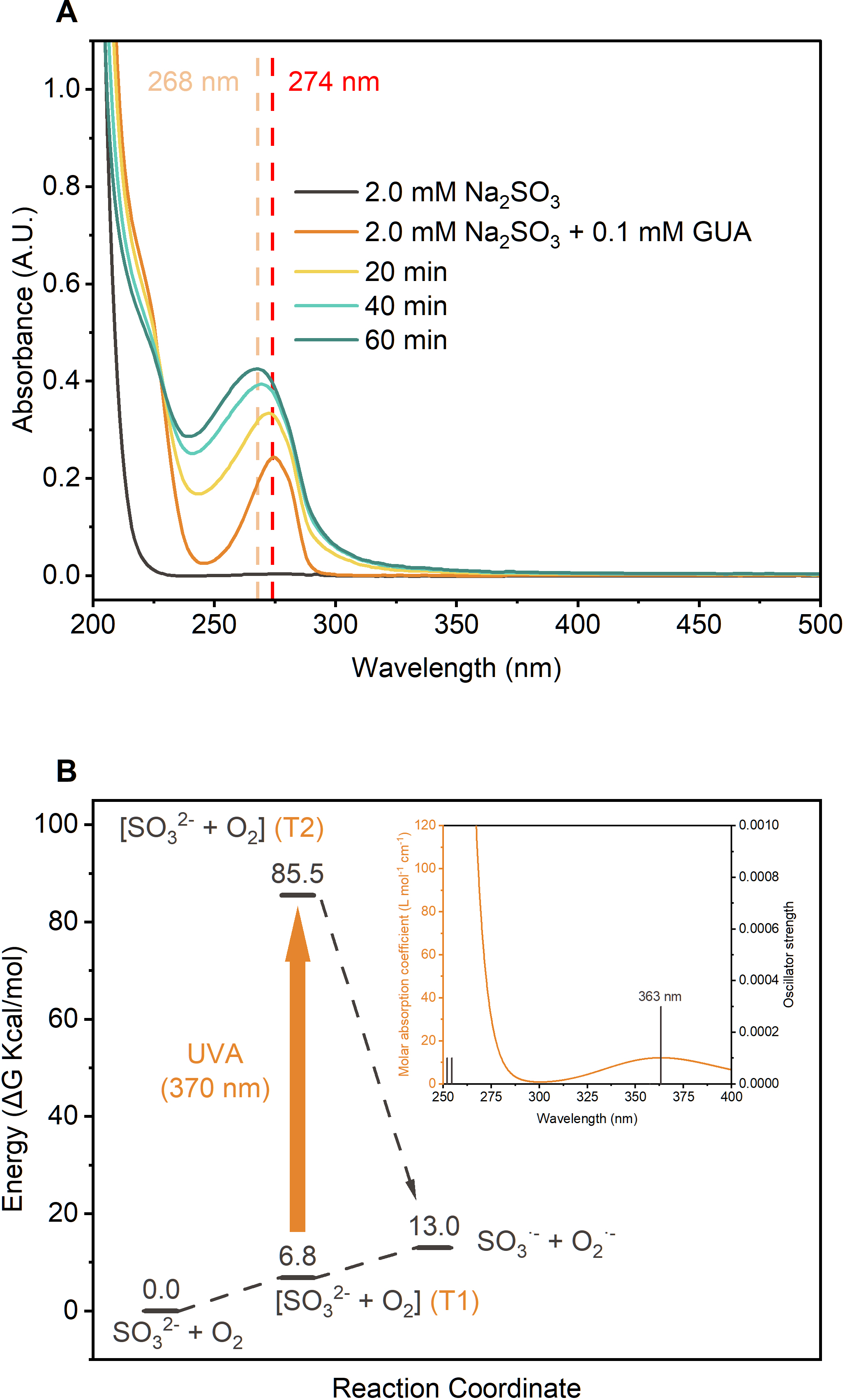 Figure 3(a) UV-vis absorption spectra of the GUA+Na2SO3 reaction solution at different time points. (b) Gibbs free energy profiles (kcal mol−1, 298.15 K) for the SO32-+O2 reaction, calculated at the CCSD(T)/aug-cc-pVTZ/SMD(water)//M06-2X/ma-TZVP/SMD(water) level with Zero Point Energy (ZPE) correction, with the inset showing the vertical excitation spectra of the [SO32-+O2] complex, calculated using TDDFT at the M06-2X/ma-TZVP/SMD(water) level.