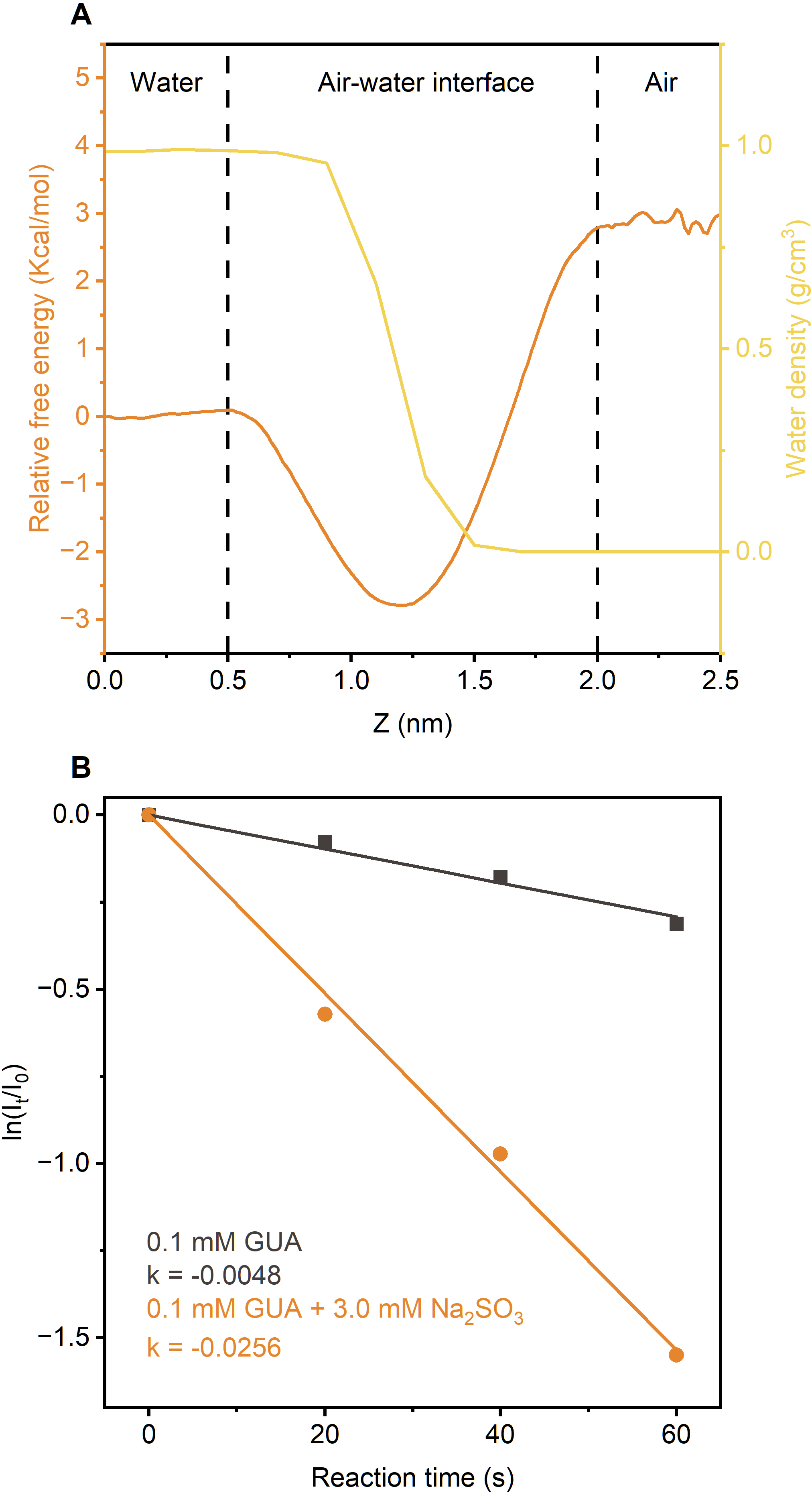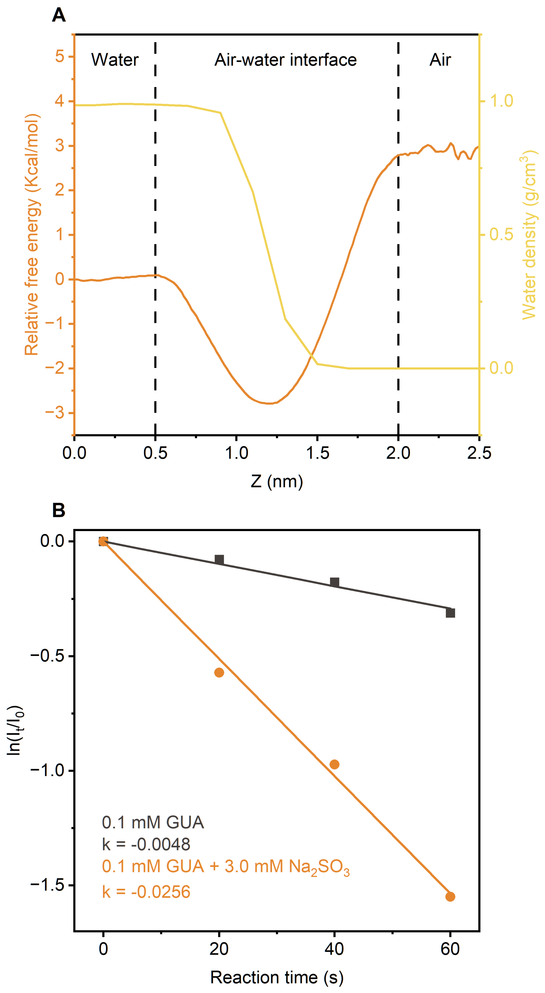 Figure 4(a) Free energy profiles for GUA transfer from the gas phase to bulk water, overlaid with water density distribution at air-water interface. (b) Kinetics of direct photodegradation of GUA in microdroplets, with and without Na2SO3, under UVA irradiation.