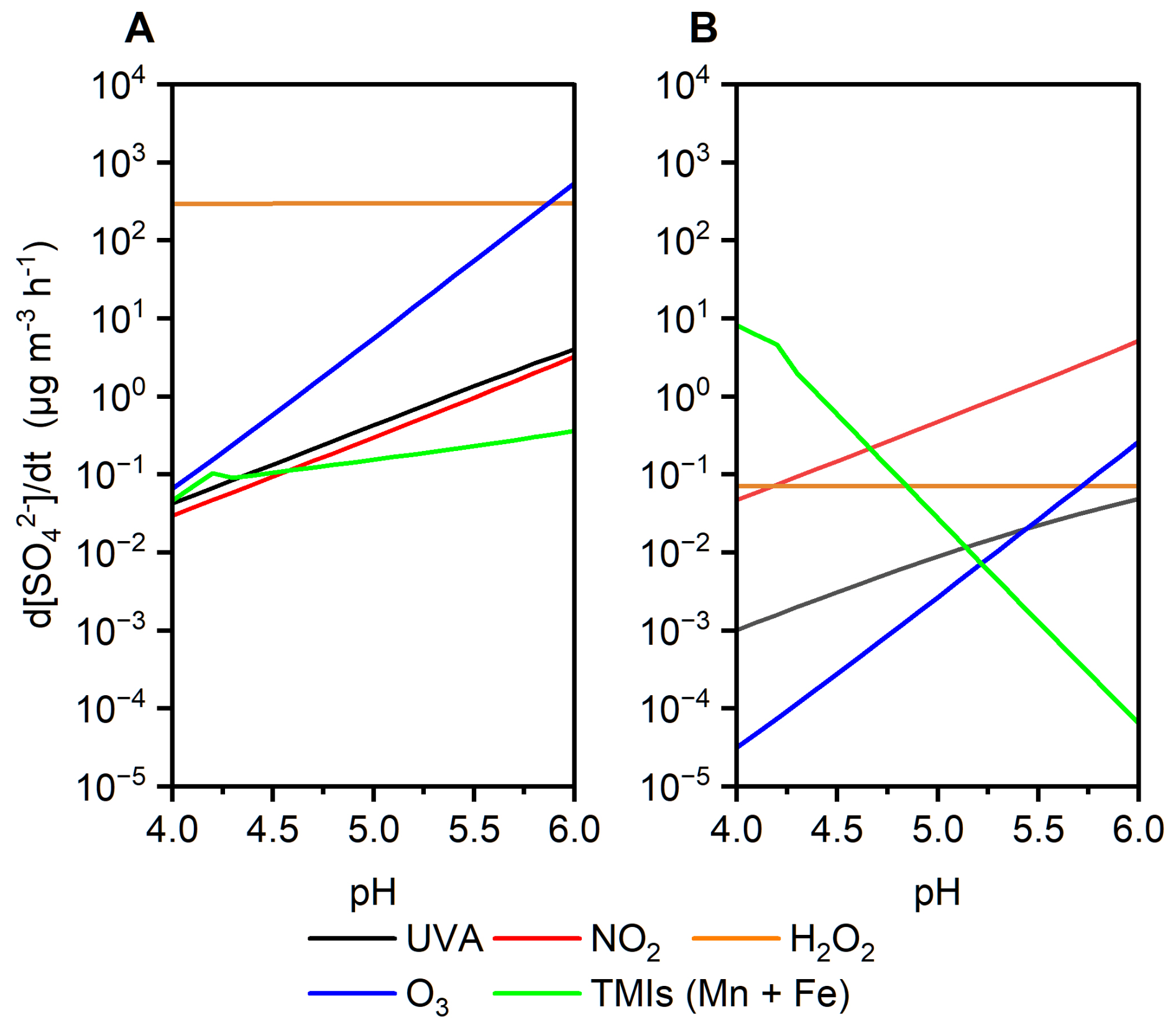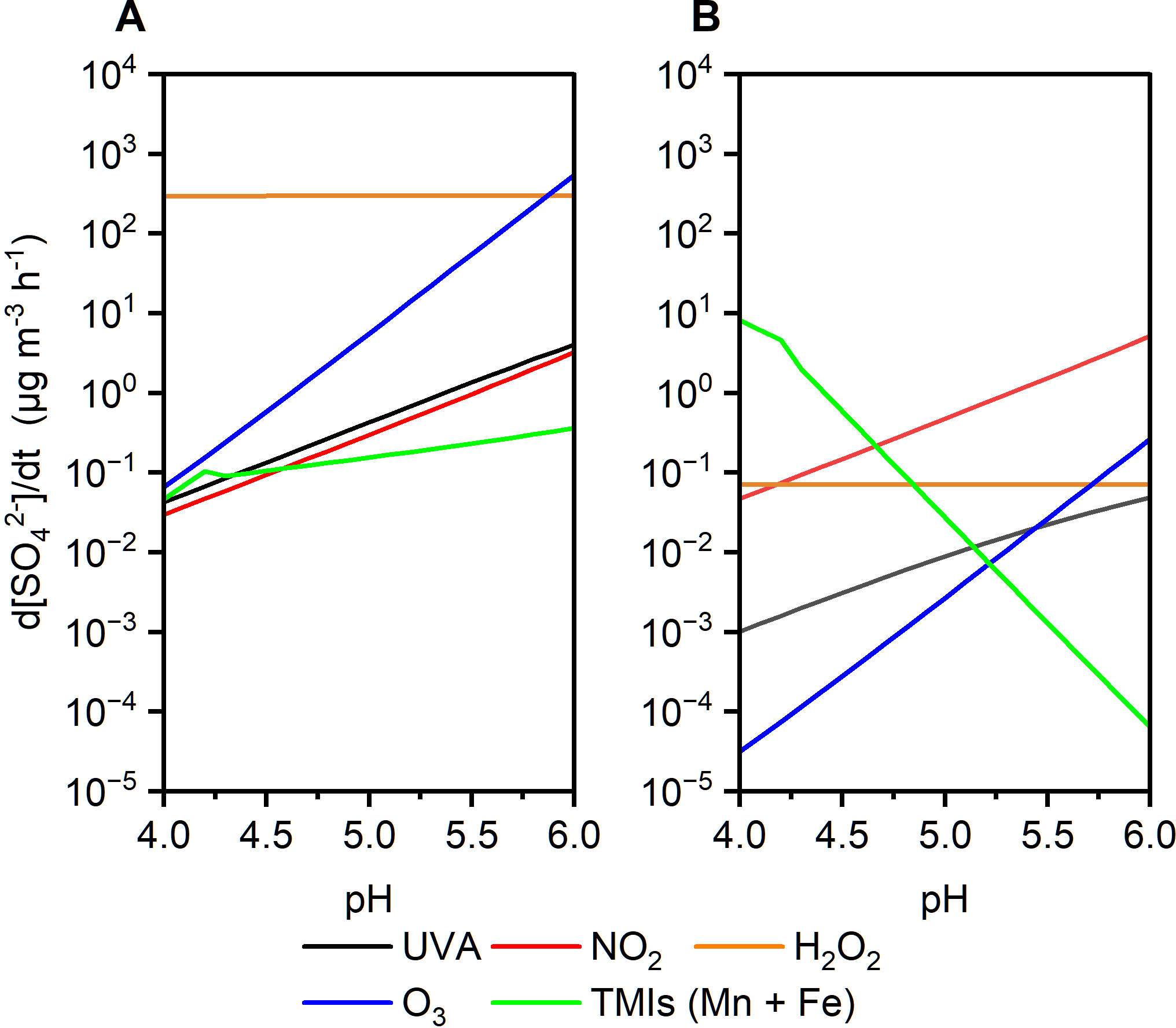 “Beijing haze” scenario: [SO2(g)]=40 ppb, [NO2(g)]=66 ppb, [H2O2(g)]=0.01 ppb, [O3(g)]=1 ppb, LWC=300µg m−3. The concentrations of Fe(III) and Mn(II) were assumed to vary with pH (Cheng et al., 2016).