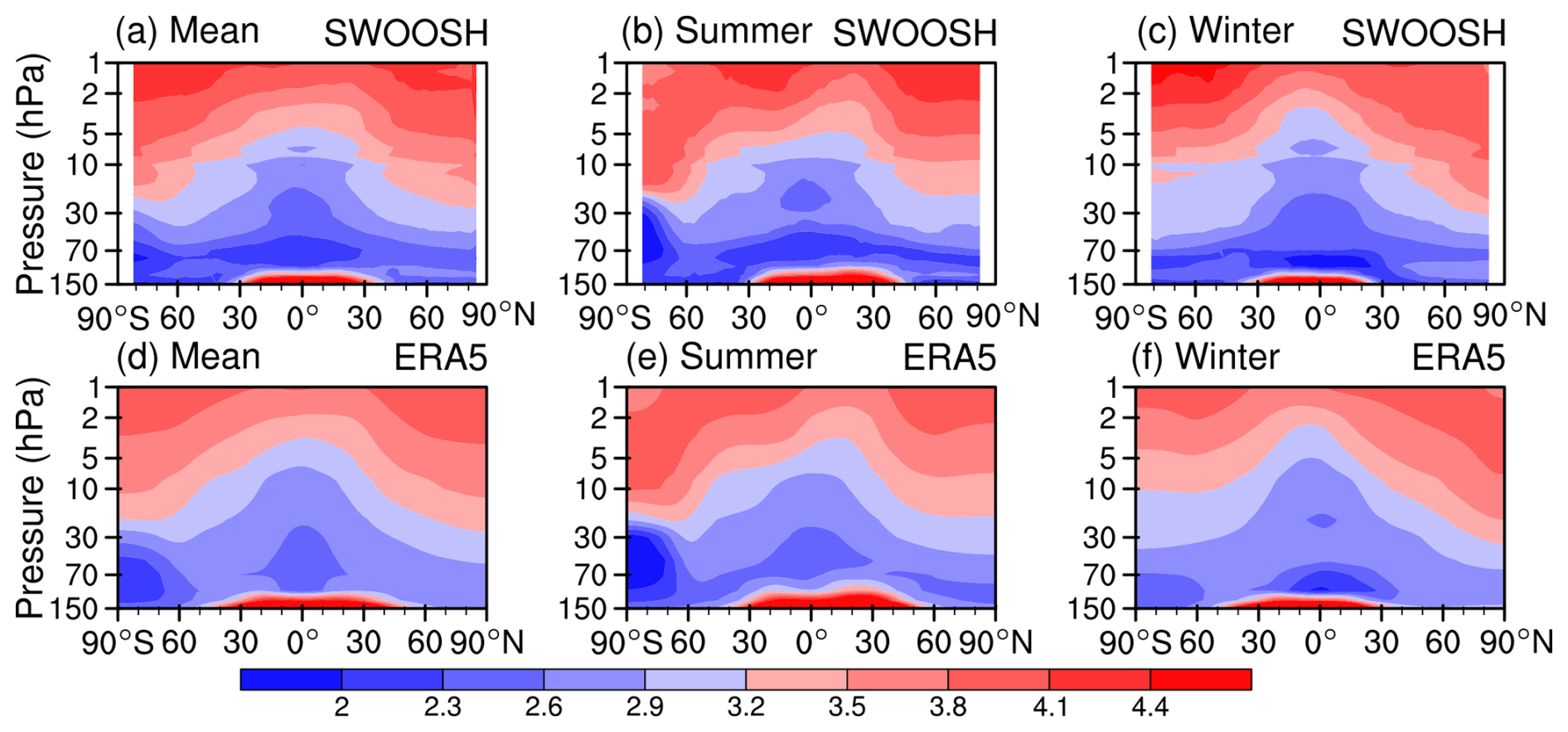 Figure 1Comparison of stratospheric water vapor from SWOOSH satellite observations and ERA5 reanalysis (unit: ppm). Panels (a)–(c) in the first row shows stratospheric water vapor from SWOOSH observations from 1992 to 2019, while panels (d)–(f) in the second row display stratospheric water vapor derived from ERA5 reanalysis from 1992 to 2019. (a, d) Multi-year mean stratospheric water vapor mass mixing ratio. (b, e) Mean stratospheric water vapor mass mixing ratio in northern summer. (c, f) Mean stratospheric water vapor mass mixing ratio in northern winter.