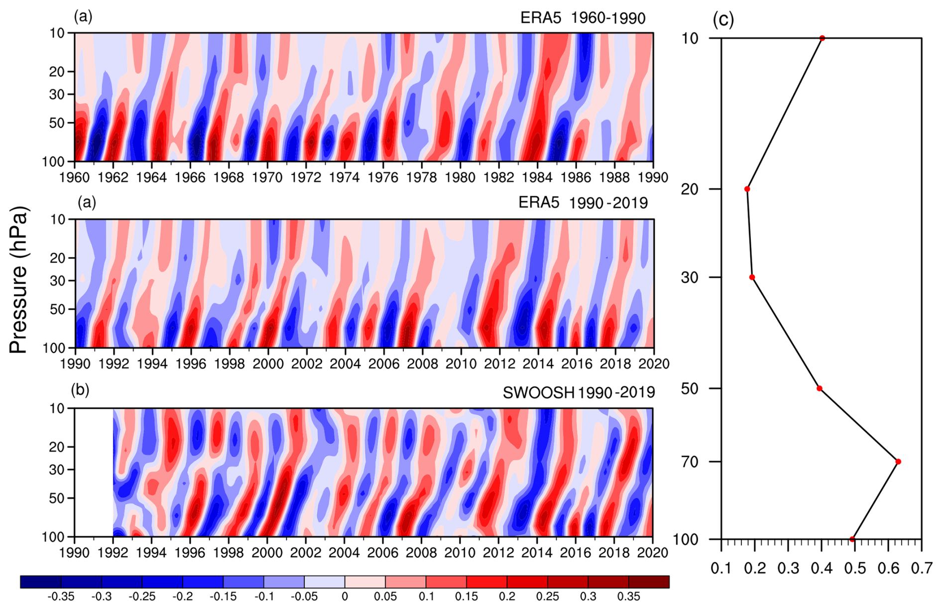 Figure 2(a) Temporal variations of water vapor anomalies averaged over the equator (5° S–5° N) with removed linear trends in the tropical stratosphere from 1960–2019 for ERA5 reanalysis (mass mixing ratio, units: ppm). (b) Water vapor anomalies from 1992–2019 for SWOOSH data (mass mixing ratio, units: ppm). (c) Correlation between SWOOSH and ERA5 at each pressure level. The anomalies are filtered by applying a 15–60-month Butterworth bandpass filter.