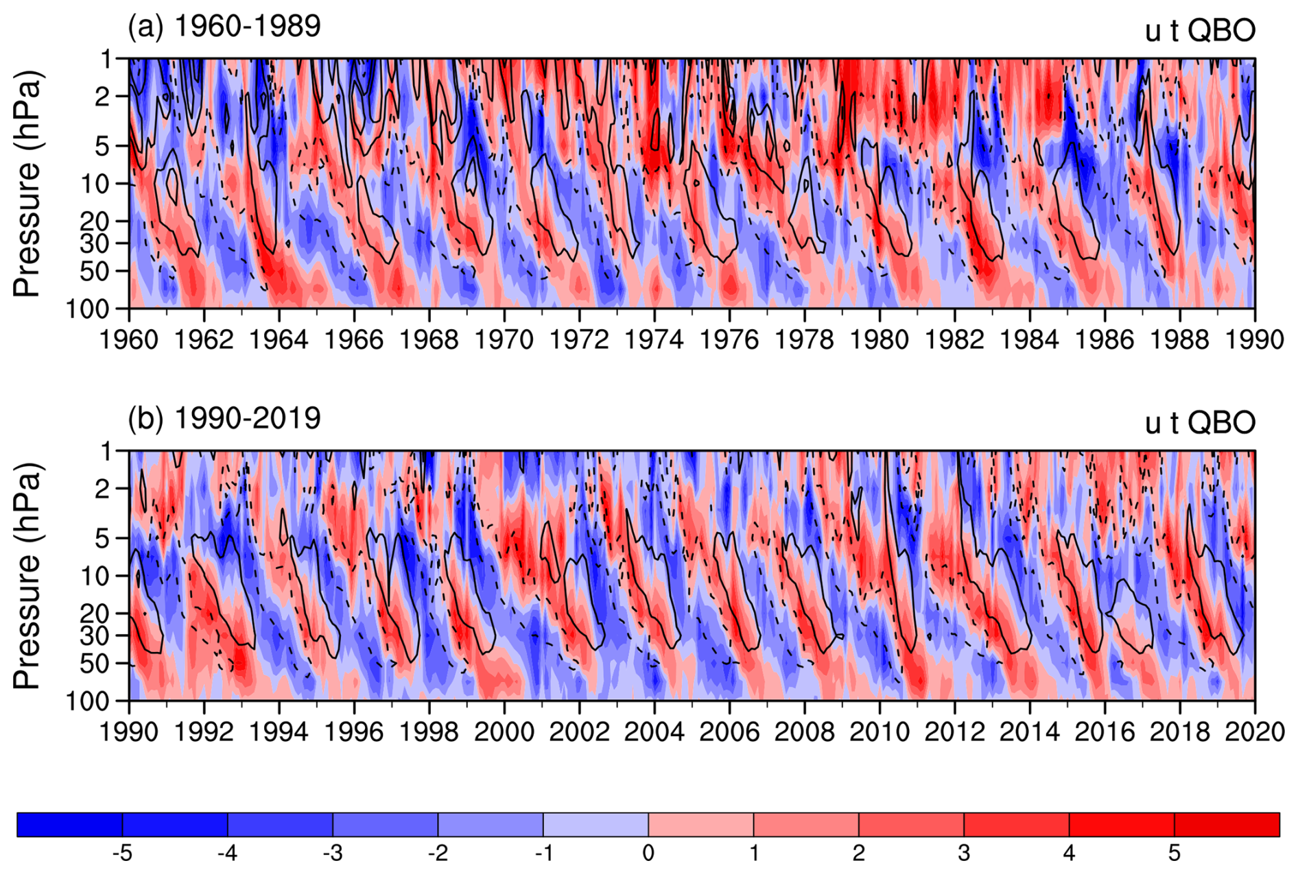 The QBO index is defined as the stratospheric zonal mean zonal wind anomaly over the equator at 5° S–5° N (Baldwin et al., 2001; Rao et al., 2020a). Since the QBO wind variability is maximized around 30 hPa and for many CMIP models the QBO signal is not present below 30 hPa, the QBO index at 30 hPa is employed. QBO events are selected when the QBO index is greater than 5 (less than −5) m s−1 to build the westerly QBO (easterly QBO) composites, following previous studies (e.g., Rao et al., 2020a, b).