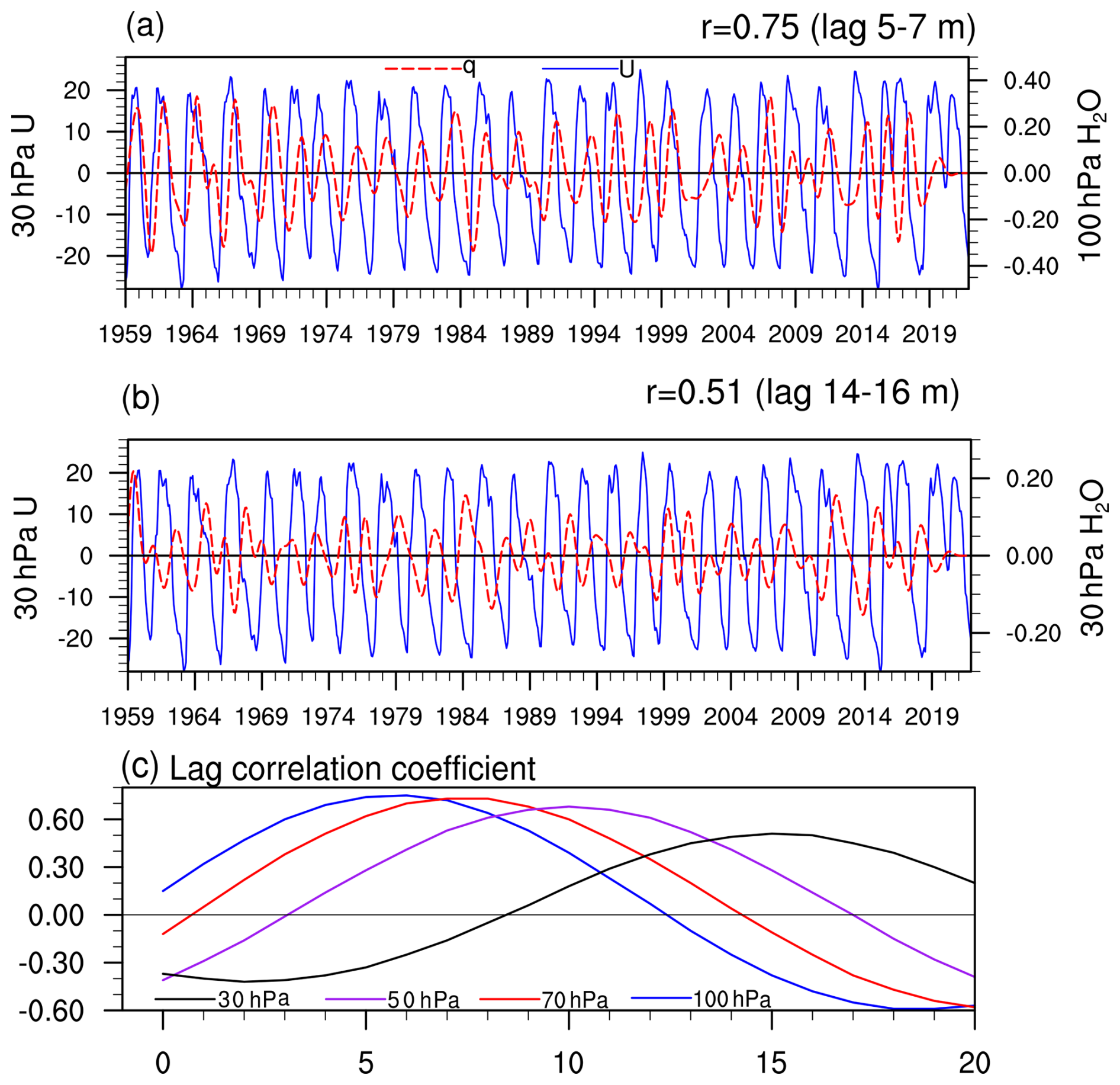 Figure 4Zonal mean zonal wind anomalies at 30 hPa (unit: m s−1) and water vapor anomalies (unit: ppm) in the tropics (5° S–5° N) from 1959–2019 for ERA5 reanalysis at (a) 100 hPa, (b) 30 hPa. (c) The lag correlation coefficient between 30 hPa zonal wind and water vapor lagging by different months. Water vapor anomalies are bandpass filtered to focus on periodicities of 15–60 months, and zonal wind anomalies are linearly detrended.