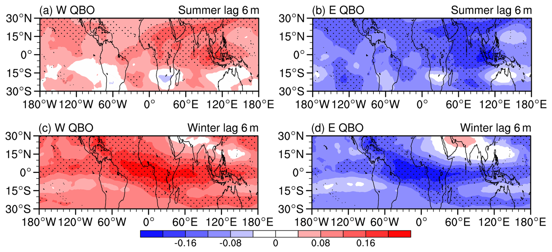 The primary source of stratospheric water vapor is tropical tropospheric water vapor entering the stratosphere. Figure 4 shows that the modulation effect of QBO (30 hPa zonal wind) on 100 hPa water vapor reaches its maximum after a lag of half a year. Therefore, Fig. 5 shows the 100 hPa water vapor anomalies lagging by 6 months at different QBO phases in winter and summer. During the QBO westerly phase in the northern summer, water vapor in the tropics with a lag of 6 months increases, and the center of the positive anomaly magnitude exceeds 0.12 ppm in the Indo-Pacific region (Fig. 5a). During the QBO easterly phase in the northern summer, water vapor with a lag of 6 months decreases with the maximum center of 0.16 ppm in the Indo-Pacific region (Fig. 5b). These summer anomalies are smaller than the winter anomalies. Namely, during the QBO westerly phase in the northern winter, tropical water vapor with a lag of 6 months uniformly increases with the largest magnitude around 0.2 ppm in the Atlantic Ocean (Fig. 5c), and the dehydration with a lag of 6 months during the QBO easterly phase in the northern winter also peaks around −0.2 ppm in the Atlantic Ocean (Fig. 5d). The amplitude of the water vapor response with a lag of 6 months at 100 hPa to the QBO forcing in winter is larger than that to the QBO forcing in summer.