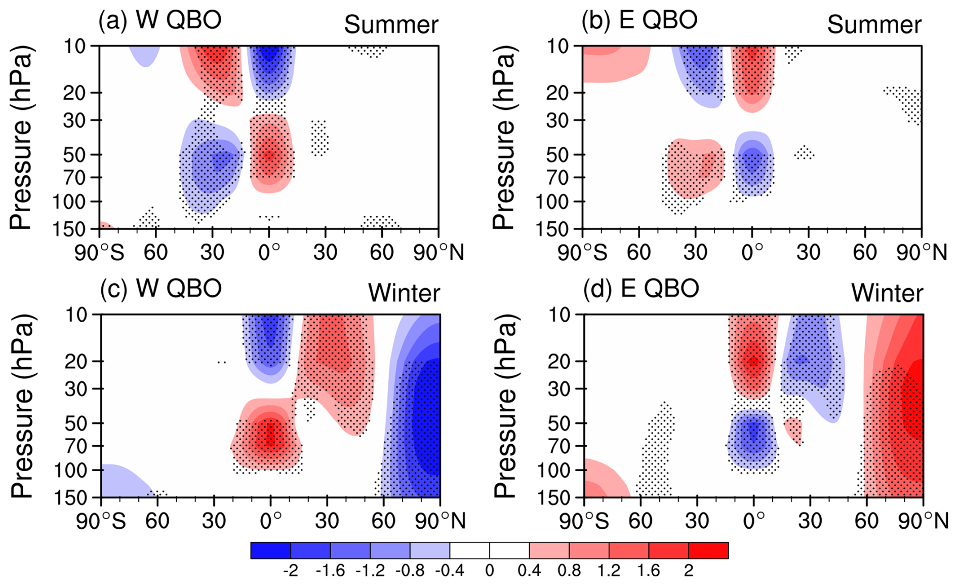 Under the QBO westerly phase in boreal summer, the tropical lower stratosphere around 30–100 hPa warms, as expected from thermal wind balance (Allen and Sherwood, 2008). The temperature anomalies in the southern hemisphere subtropics are nearly opposite to those in the tropics, with cold anomalies in the lower stratosphere (Fig. 6a). Under the QBO easterly phase in boreal summer, the tropical lower stratosphere around 30–100 hPa cools, and the temperature anomalies in the southern hemisphere subtropics are opposite to those in the tropics, with warm anomalies in the lower stratosphere (Fig. 6b). Under the westerly QBO phase in boreal winter, the tropical lower stratosphere around 30–100 hPa is anomalously warm, and the northern hemisphere subtropics are controlled by warm anomalies around 10–70 hPa (Fig. 6c). Under the easterly phase in boreal winter, the lower stratosphere in the tropics is anomalously cold, and the northern subtropics stratosphere around 50 hPa is weakly warm (Fig. 6d).