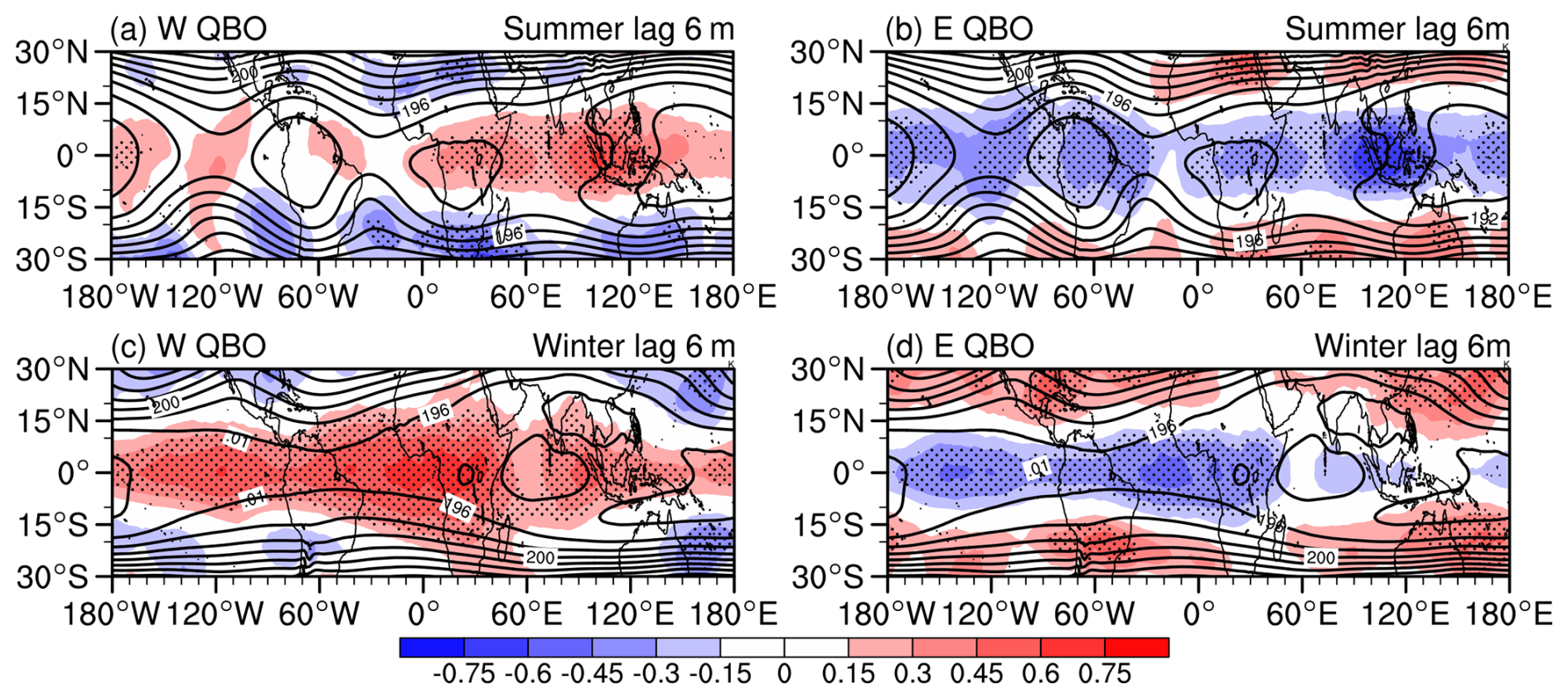 As the influence of the QBO signal gradually propagates to lower layers, the temperature anomaly with a lag of 6 months at 100 hPa is shown in Fig. 7. Under the QBO westerly phase in the northern summer, warm anomalies are distributed in a band-like pattern in the equatorial region, with the warmest point in the Indo-Pacific Warm Pool reaching 0.45 K (Fig. 7a). Under the QBO easterly phase in the northern summer, the cold anomalies occurred in the equatorial region, and the cold center in the Indo-Pacific Warm Pool was −0.45 K (Fig. 7b). Under the QBO westerly phase in the northern winter, the range of warm anomalies in the equatorial region is wider, with the anomaly amplitude of ∼0.6 K in the Atlantic Ocean and Africa (Fig. 7c). Under the QBO easterly phase in the northern winter, cold anomalies occur with a center of ∼0.45 K in the Atlantic Ocean (Fig. 7d). The QBO at 30 hPa affects the 100 hPa temperature amplitude half a year later, which in turn influences the water vapor entering the stratosphere. The QBO delayed impact in the northern winter is still stronger than that in summer.